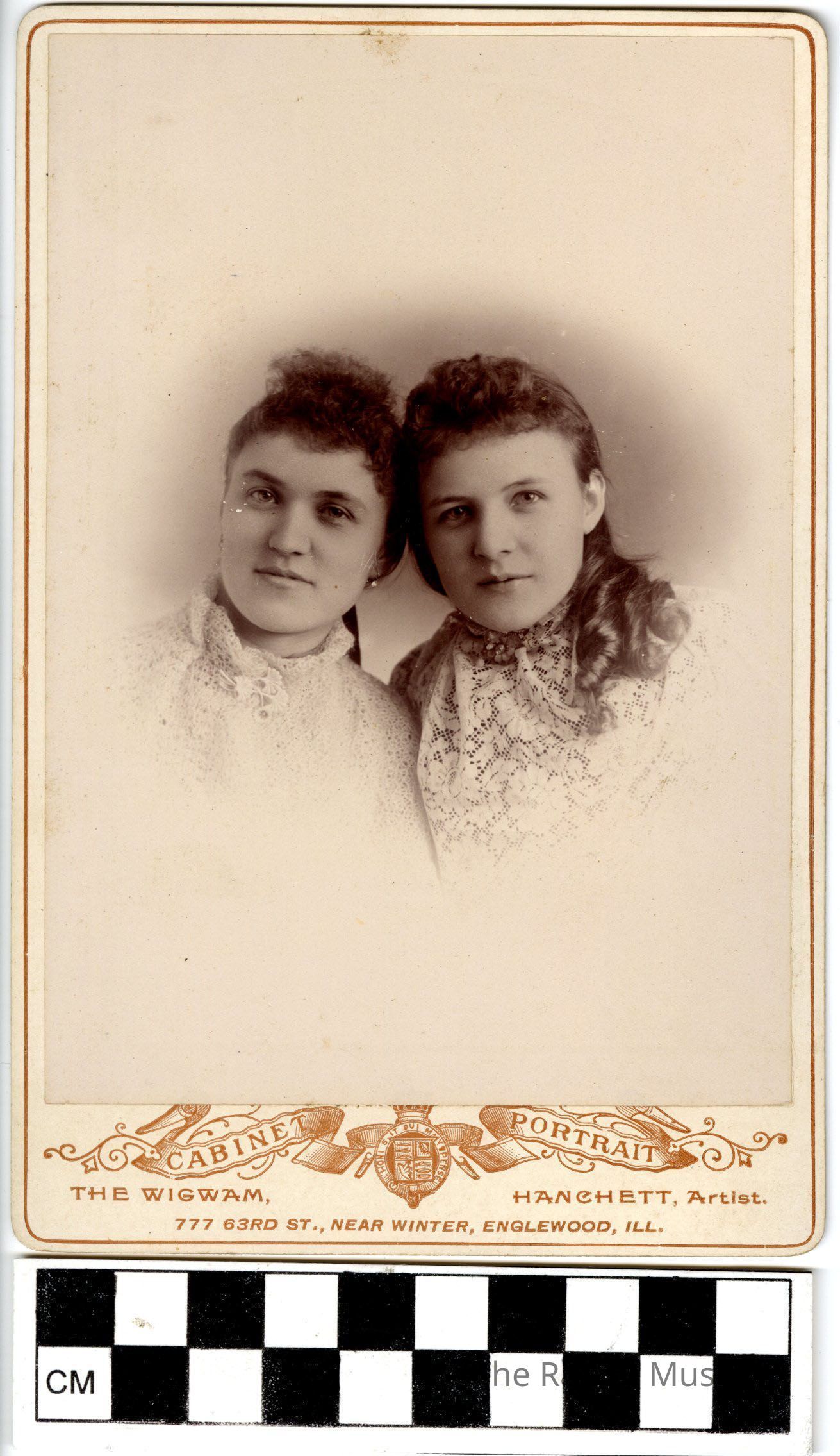 One (1) black and white photograph of two girls from the shoulders up. The girl on the left is wearing a white lace turtleneck top, with pearl earrings and her hair pulled back. The girl on the right is wearing a white lace top with dark undershirt, and has her hair in curls. The photo is attached to a white mat board. On the bottom is printed in brown: "Cabinet Portrait; The Wigwam; Hanchett, Artist; 777 63rd St., Near Winter, Englewood, ILL.