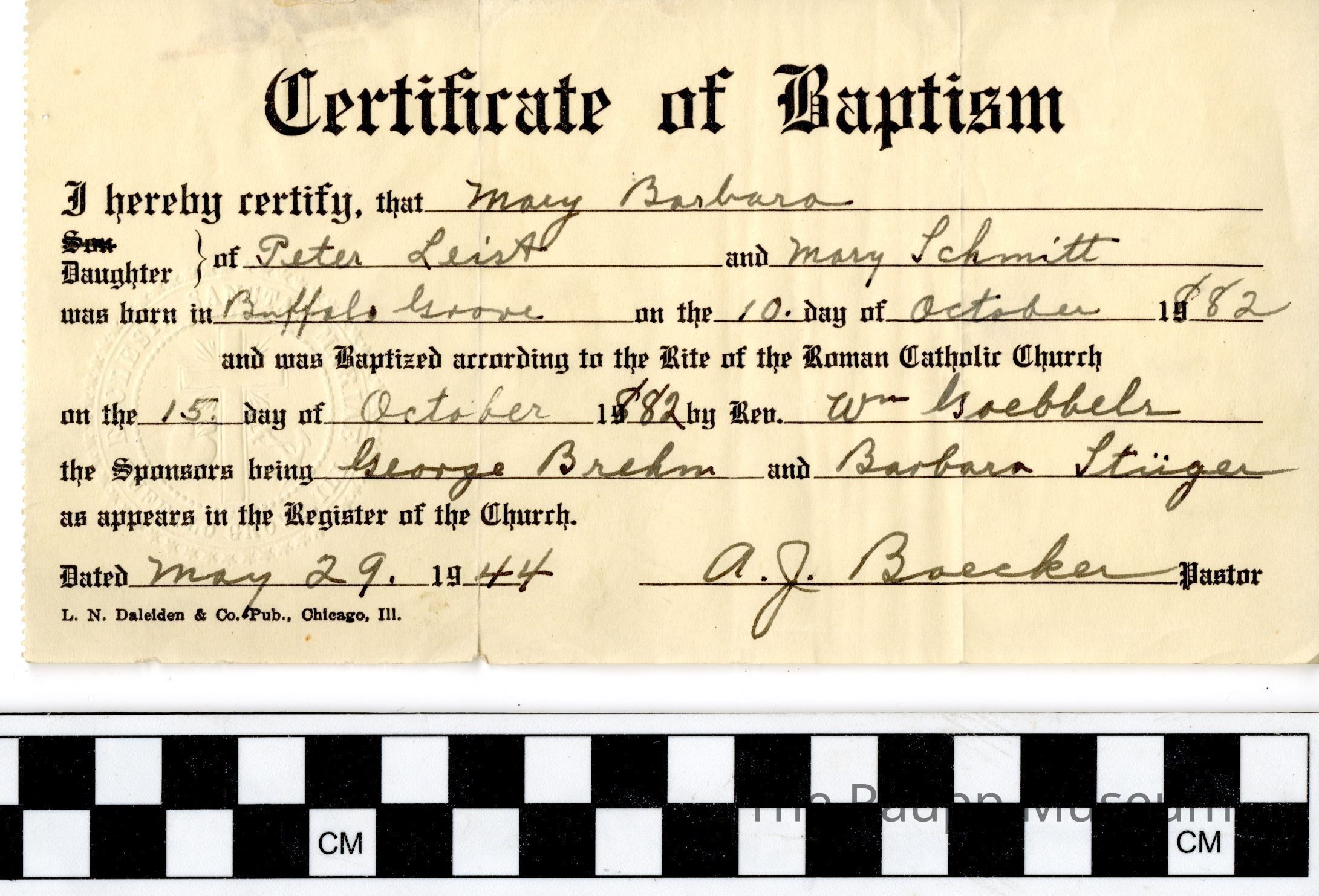 Text States: "I hereby certify, that Mary Barbara Daughter of Peter Leist and Mary Schmitt was born in Buffalo Grove on the 10 day of October 1882 and was Baptized according to the Rite of the Roman Catholic Church on the 15 Day of October 1882 by Rev. W. Goebbels the sponsors being George Brehm and Barbara stuger as appears in the Register of the Church. Dated May 29th, 1944, A.J. Boeker, Pastor."