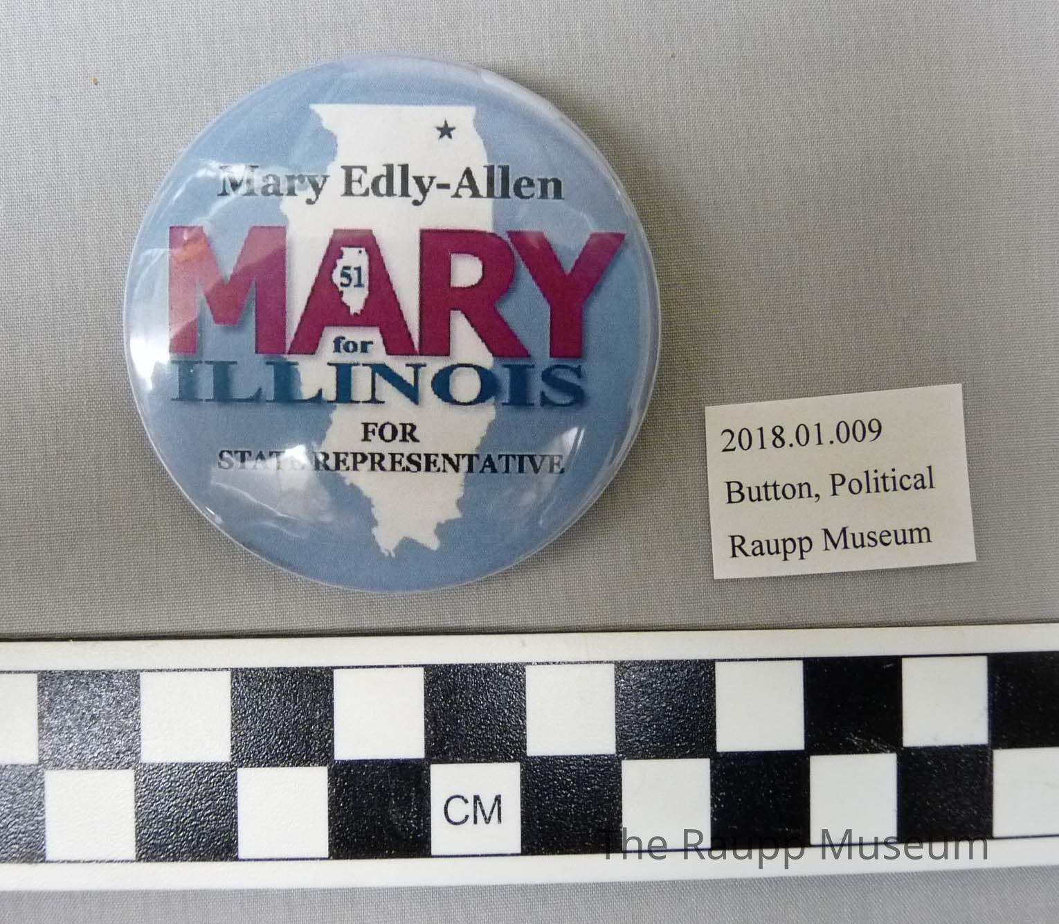 One (1) political button. The pin has the text "Mary Edly-Allen Mary for Illinois for State Representative 51" on one side, and silver on the back side. The button is white, blue, red, and black. There is a picture of the state of illinois on the front with a star near Chicago. There is a safety pin affixed to the back.Condition