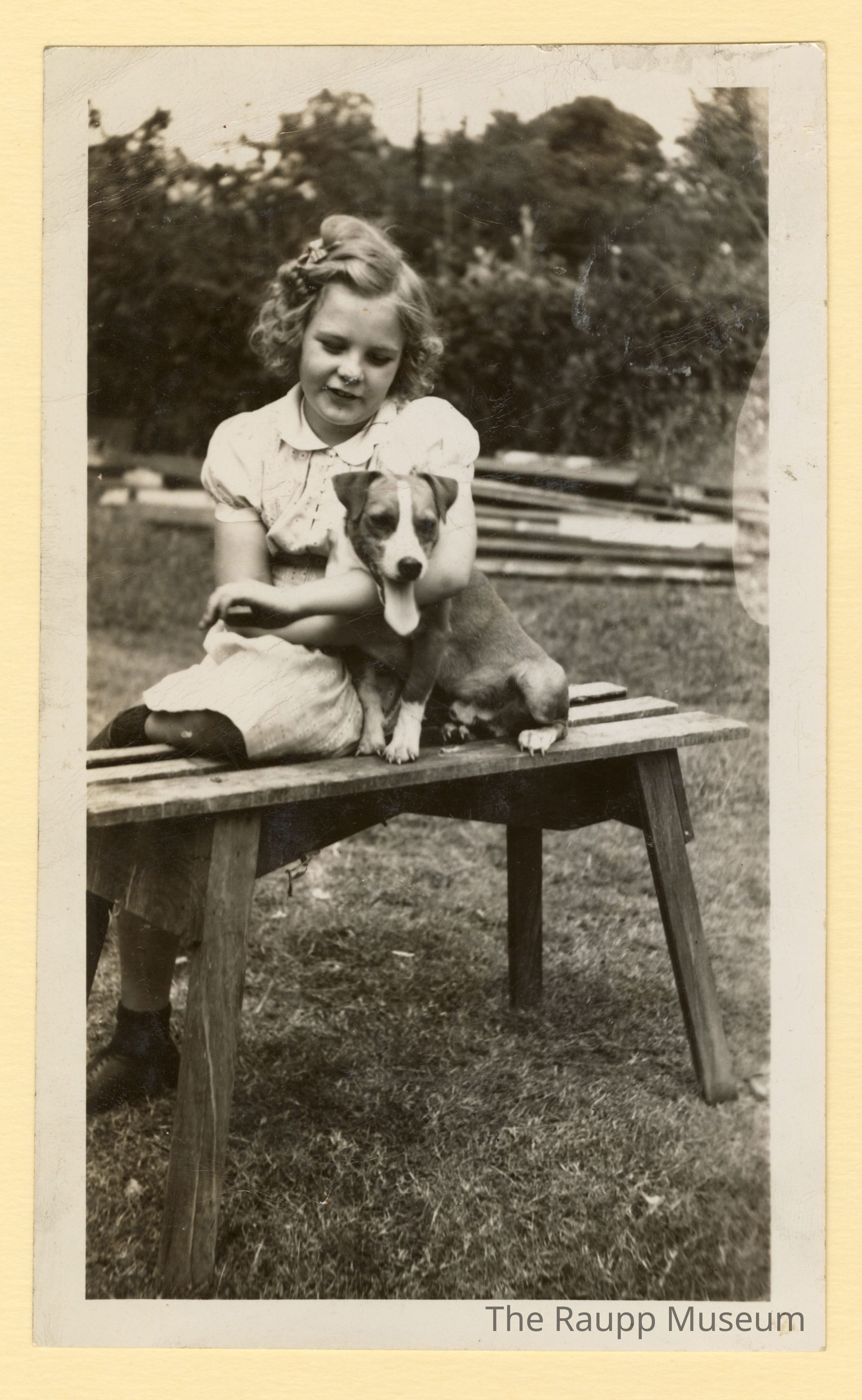 One (1) black and white photograph of Mary Jo Eul seated on a wooden bench outside with a small dog (Jack Russel terrier?). She has a white dress on, short curly hair, and black shoes. She has her left arm wrapped around the dog. There are trees and wooden planks visible behind her.