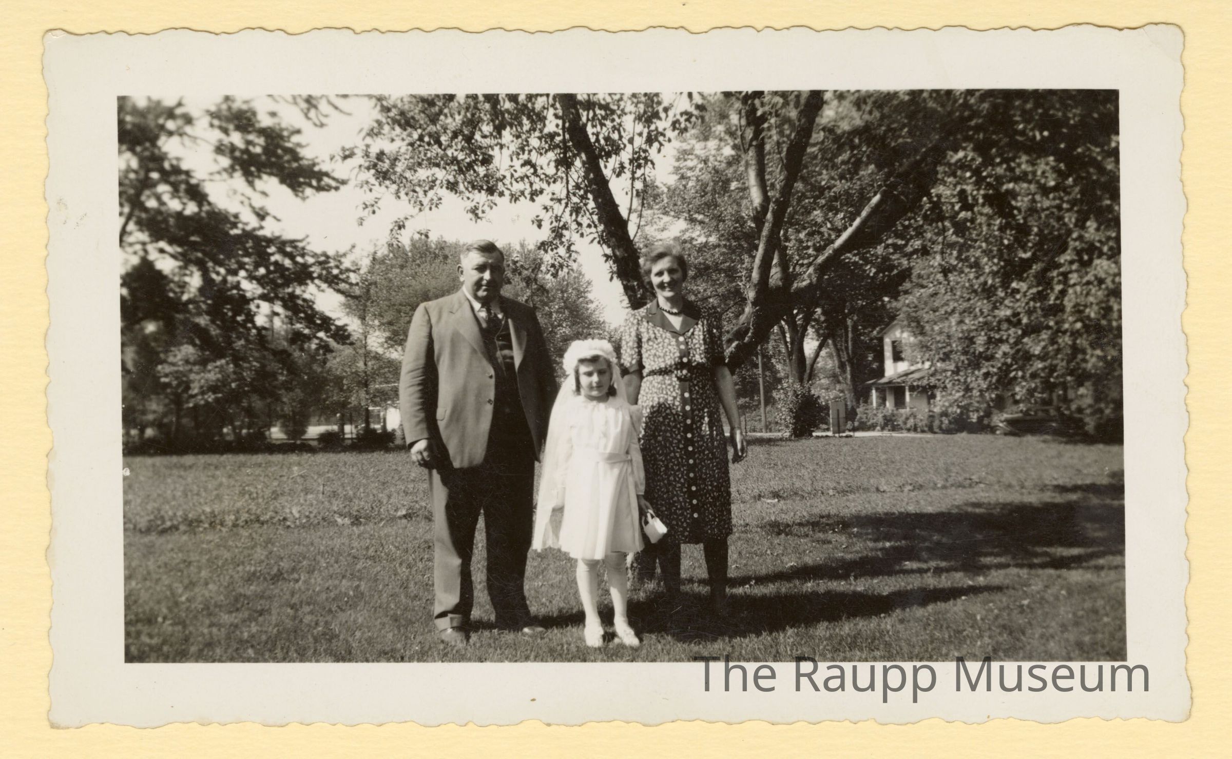 One (1) black and white photograph of Mary Jo Eul as a child, with John Weidner and Ellen Ray (her godparents). Mary Jo Eul is wearing a white dress with a white veil and holding a small white bag. John is in a dark suit and Ellen is in a white and black patterned dress with buttons down the front. Behind them is a white house, obscured by trees, and a field and more trees around them. There is white border with uneven edges.