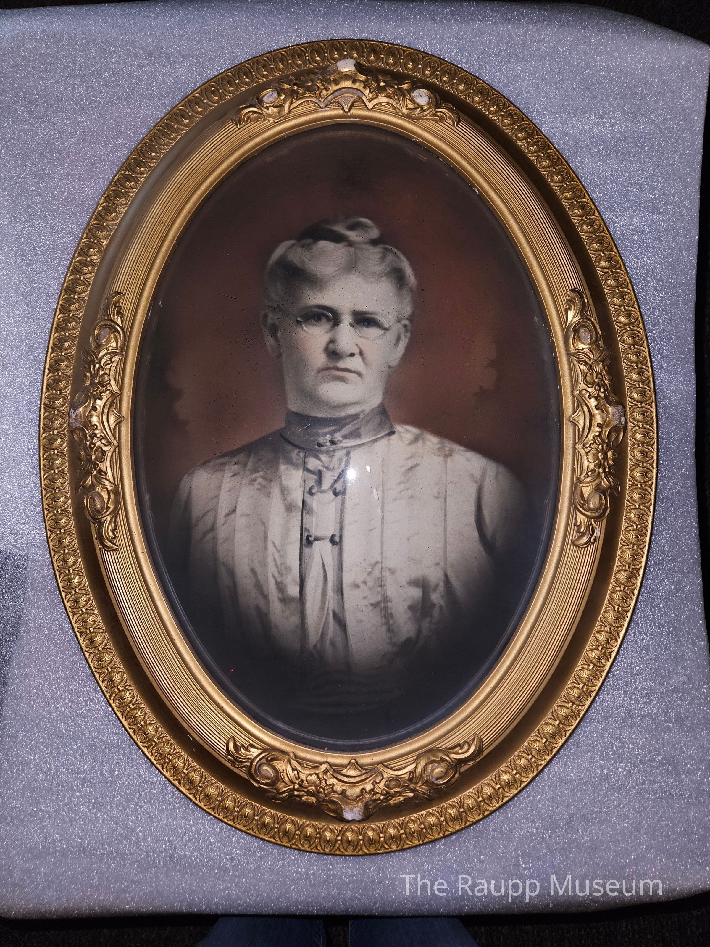 One (1) framed photograph of Mary Gloden/Leikam circa early 1900s. The photo is black and white photograph painted to be colored. Frame is oval shaped, with widest part horizontal. Glass in front is rounded and concave.