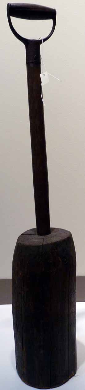 Solid wood masher with cylindrical body and metal and wood handle. Handle is starting to rust. Potentially used in making sauerkraut.Dimensions