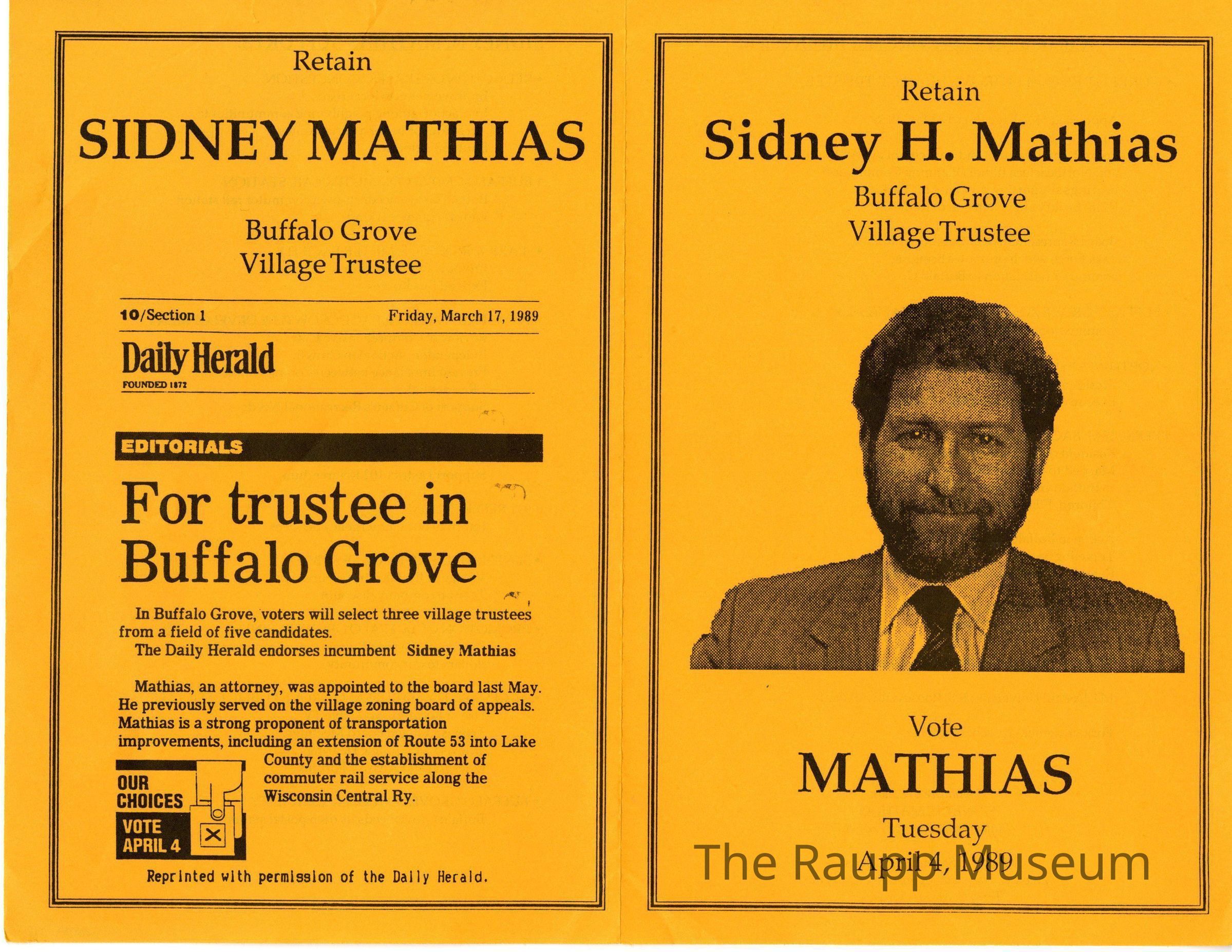 One (1) orange and black election pamphlet for Sidney H. Mathias for BG Village Trustee. Has photo on front with information on both sides about candidate.