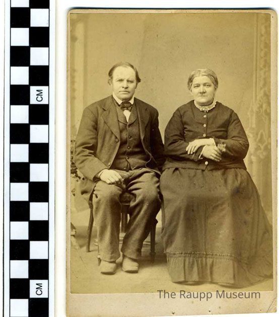 Yellowed photographic print mounted to a tan cabinet card. Portrait image of Melchior Raupp and Maria Theobald Raupp. Melchior seated on the left wearing a three piece suit and bow tie with his arm resting on his knee. Maria wearing a dark suit dress with lace collar and slightly ruffled skirt hem.