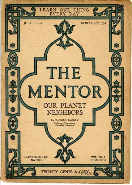 One (1) "The Mentor" magazine, focusing on "Our Planet Neighbors," written by Harold Jacoby, dated July 1, 1917, labeled as serial number 134, with green geometric decorative borders, and priced at twenty cents a copy. It belongs to Volume 5, Number 10, under the Department of Nature with the motto "Learn One Thing Every Day" printed on top. Cover is beige cardstock, with green decorative borders. 12 pages, double sided, with black and white photos throughout.Book Details