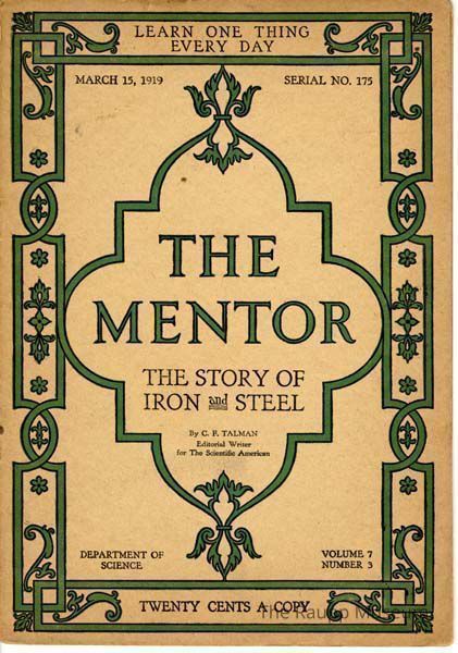 One "The Mentor" magazine, focusing on "The Story of Iron and Steel," written by C.P. Talman, dated March 15 15, 1919, labeled as serial number 175, with green geometric decorative borders, and priced at twenty cents a copy. It belongs to Volume 7, Number 3, under the Department of Science with the motto "Learn One Thing Every Day" printed on top. Cover is brown cardstock, with green decorative borders. 12 pages, double sided, with black and white photos throughout.Book Details