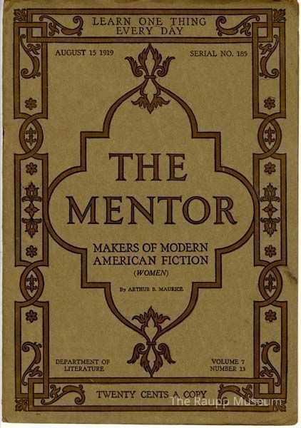 One "The Mentor" magazine, focusing on "Makers of Modern American Fiction (Women)," written by Arthur B. Maurice, dated August 15, 1919, labeled as serial number 185, with geometric decorative borders, and priced at twenty cents a copy. It belongs to Volume 7, Number 13, under the Department of Literature with the motto "Learn One Thing Every Day." Cover is brown cardstock, with darker brown decorative borders. 12 pages, double sided.Book Details
