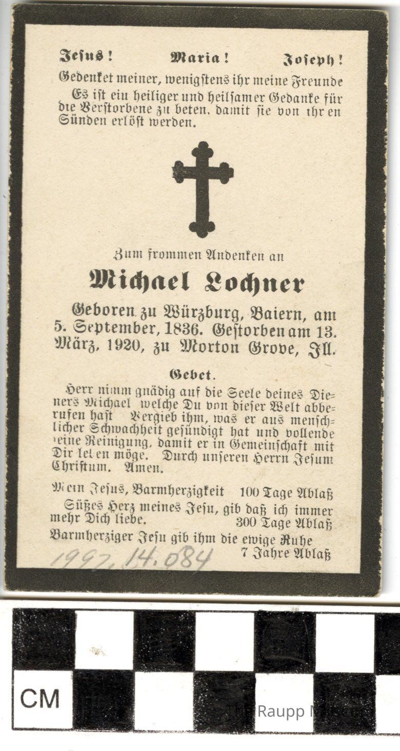 One (1) mourning prayer card for Michael Lochner, born 9/5/1836, died 03/13/1920. On one side of the card is a prayer and obituary in German. On the other side is a picture of a cemetery with a glowing cross showing through the clouds in the sky. On the ground is written the phrase: "They pass from a transitory dwelling, here below, to an eternal one in heaven."Archive Details