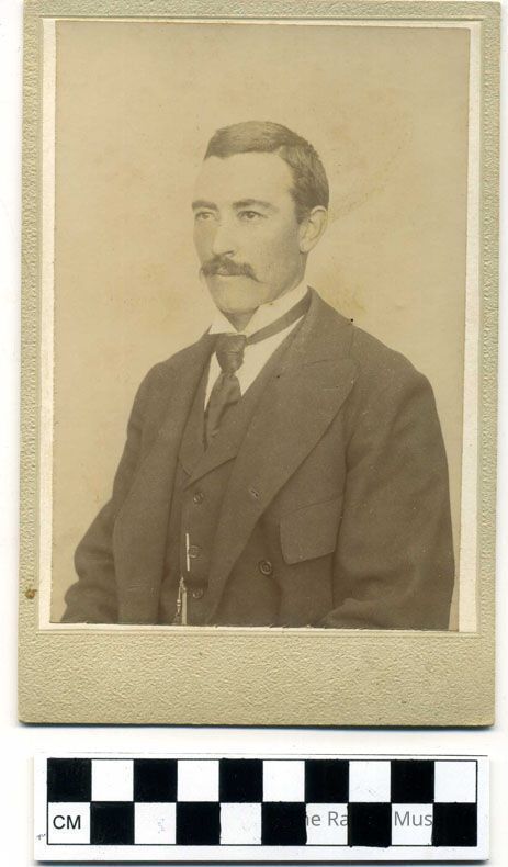 Black and white image mounted to a tan textured mount with thin embossed white border. Portrait profile image of a man with a moustache wearing a three-piece suit with high winged collar and dark necktie. reverse side has pencil and ink text: "Mike Raupp; Frank Raupp uncle."Dimensions