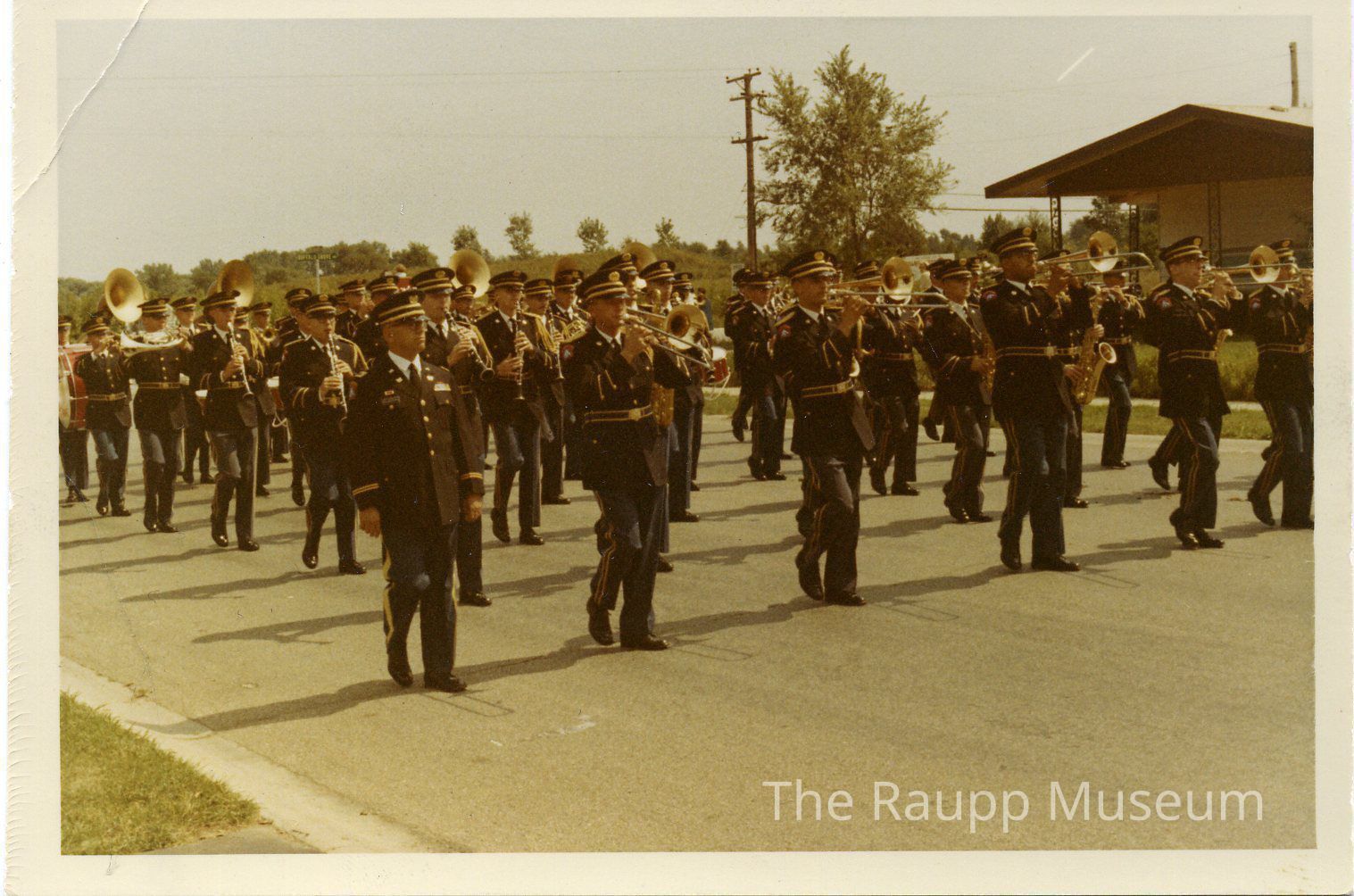 Color photographic print with white border. Image of a miltary marching band walking in a parade (possibly the Buffalo Grove Days Parade). Pencil marking "19" written on the reverse. Printed on Kodak paper.