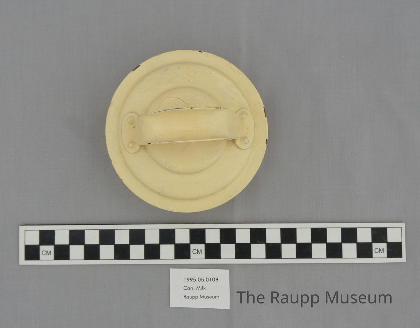 One (1) cream colored painted aluminum milk can lid. The lid is cylindrical and short, the top of the lid has a lip which is a little wider than the base. There is a handle on the top part of the lid. Matching milk can (1995.05.010A).Dimensions