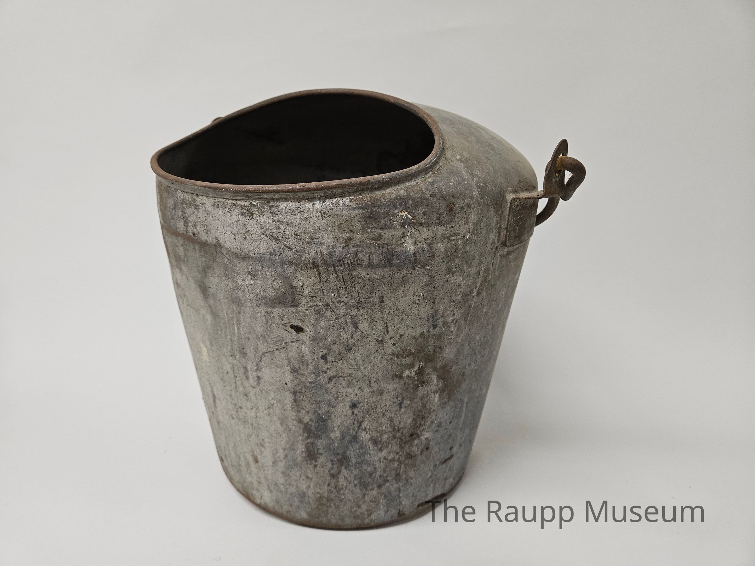 One (1) grey metal milk pail. The pail has a large oval opening on one side and a metal handle on the top that rests on the side when not in use. There is another metal handle that doesn't move on the back side.