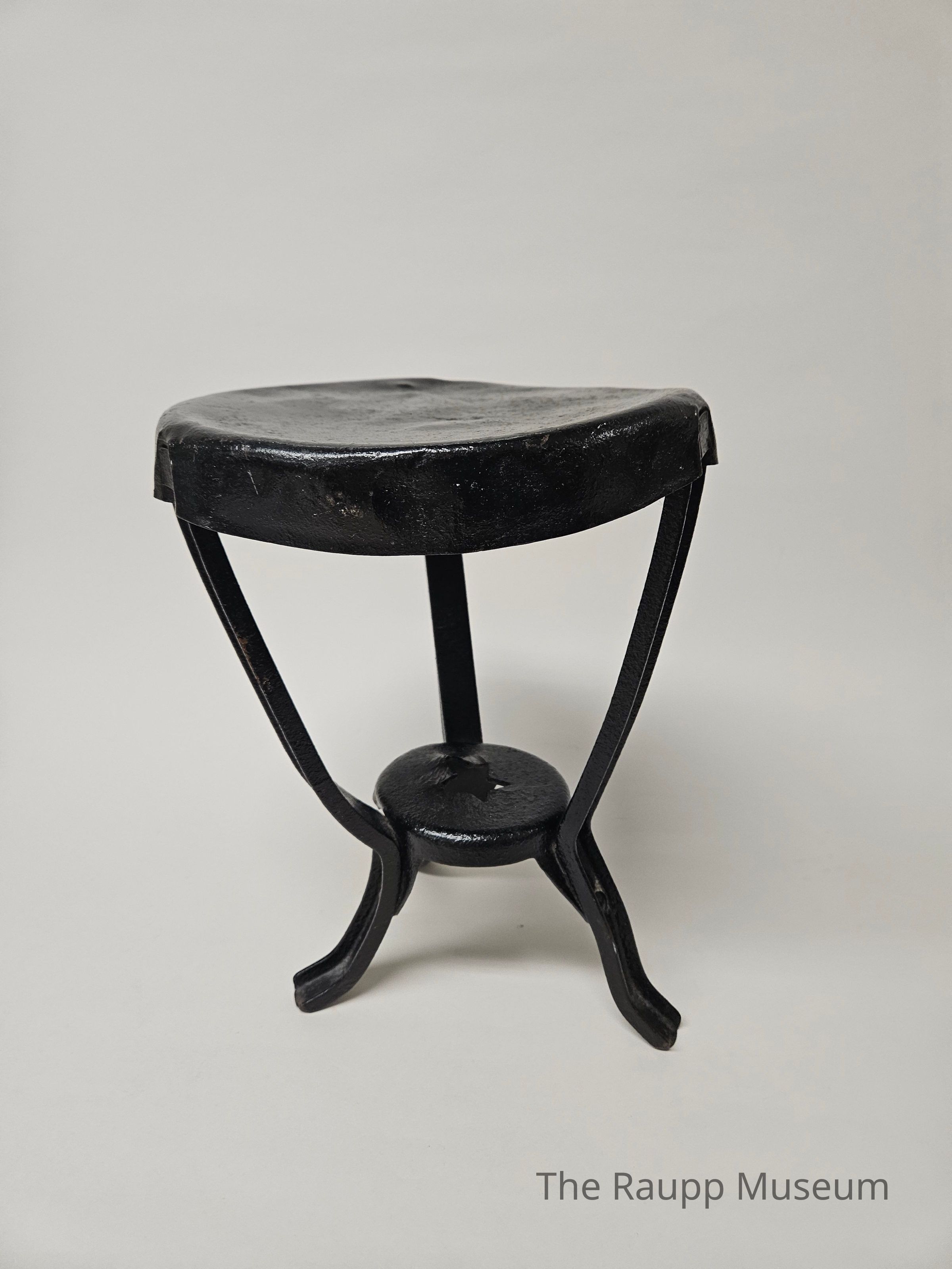 One (1) black painted metal milking stool. Stool has a round seat, with three legs shaped inward and down to create base. There isa round metal piece hear the bottom, connected to the legs, with a stamped star in the middle. Stool is screwed or nailed together in 9 spots, 3 on top and six on bottom section. Some screws appear newer than others and don't match.Dimensions