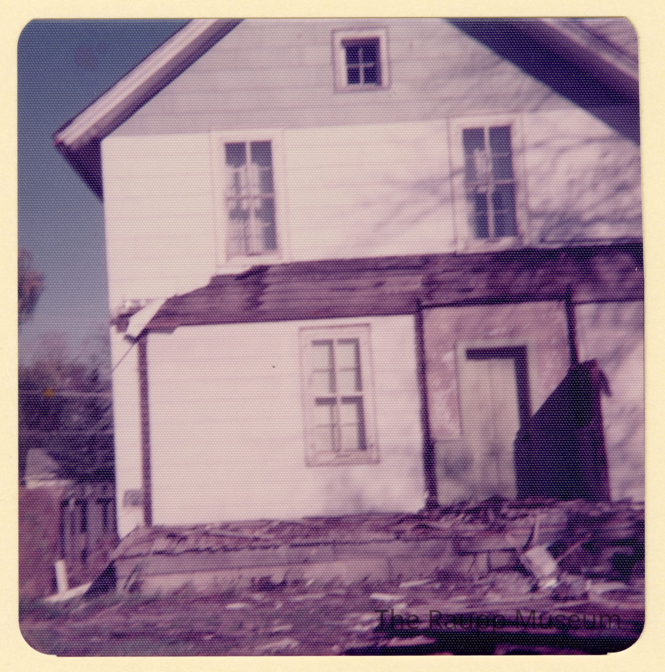 One (1) color photograph of a two story white home (Weidner family home), slightly crooked. The photo is taken from the front and four windows are visible (three large, 1 small), and the front door. The porch has been removed and there is a square outline around the door visible, with some of the side. There are wood planks on the front ground. This was taken during the moving of the Weidner family home, to make way for Lake Cook Road.
