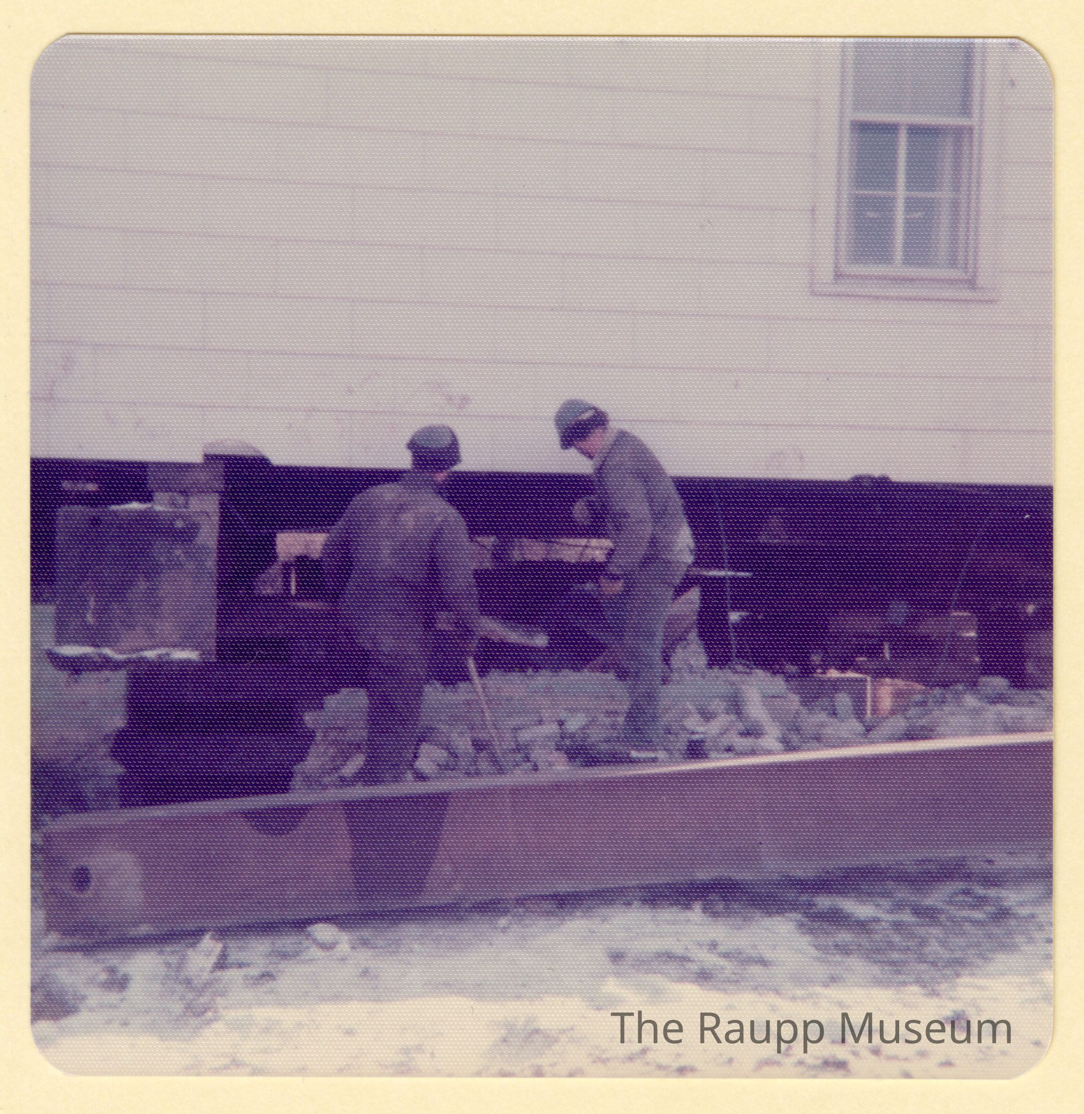 One (1) color photograph of the back of two men working on lifting the Weidner family home off its foundation. Both men have hard hats on, with brown work clothes. There is a large metla beam in the foreground, and the men are standing on rocks from the foundation next to the lifted home. The home is lifted about 4 feet off the ground with metal beams. The bottom half of the side of the shite home is visible with one window. This was taken during the moving of the Weidner family home, to make way for Lake Cook Road.