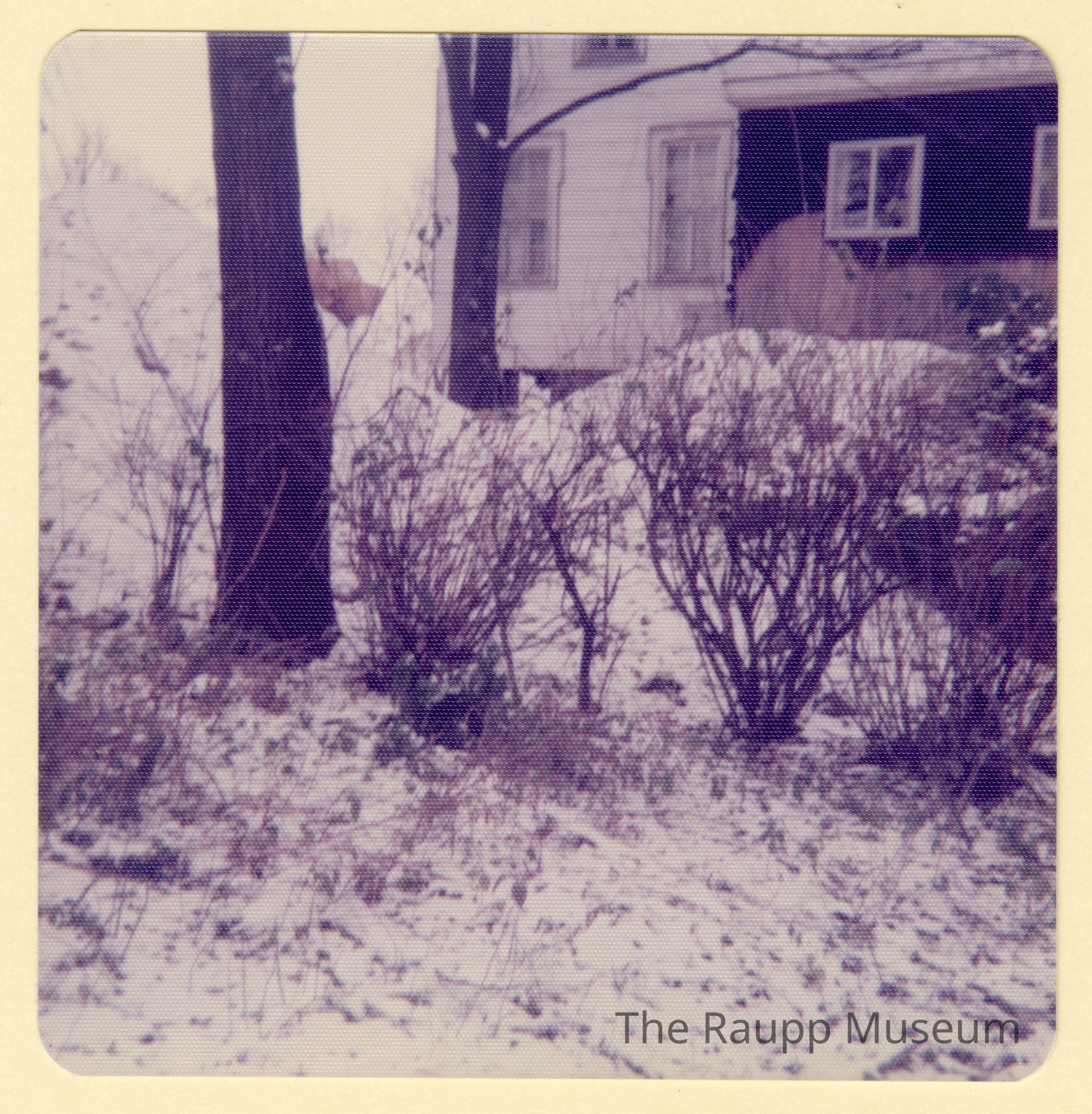 One (1) color photograph of trees and shrubs and snow. A white and black home is visible behind it. This was taken during the moving of the Weidner family home, to make way for Lake Cook Road.
