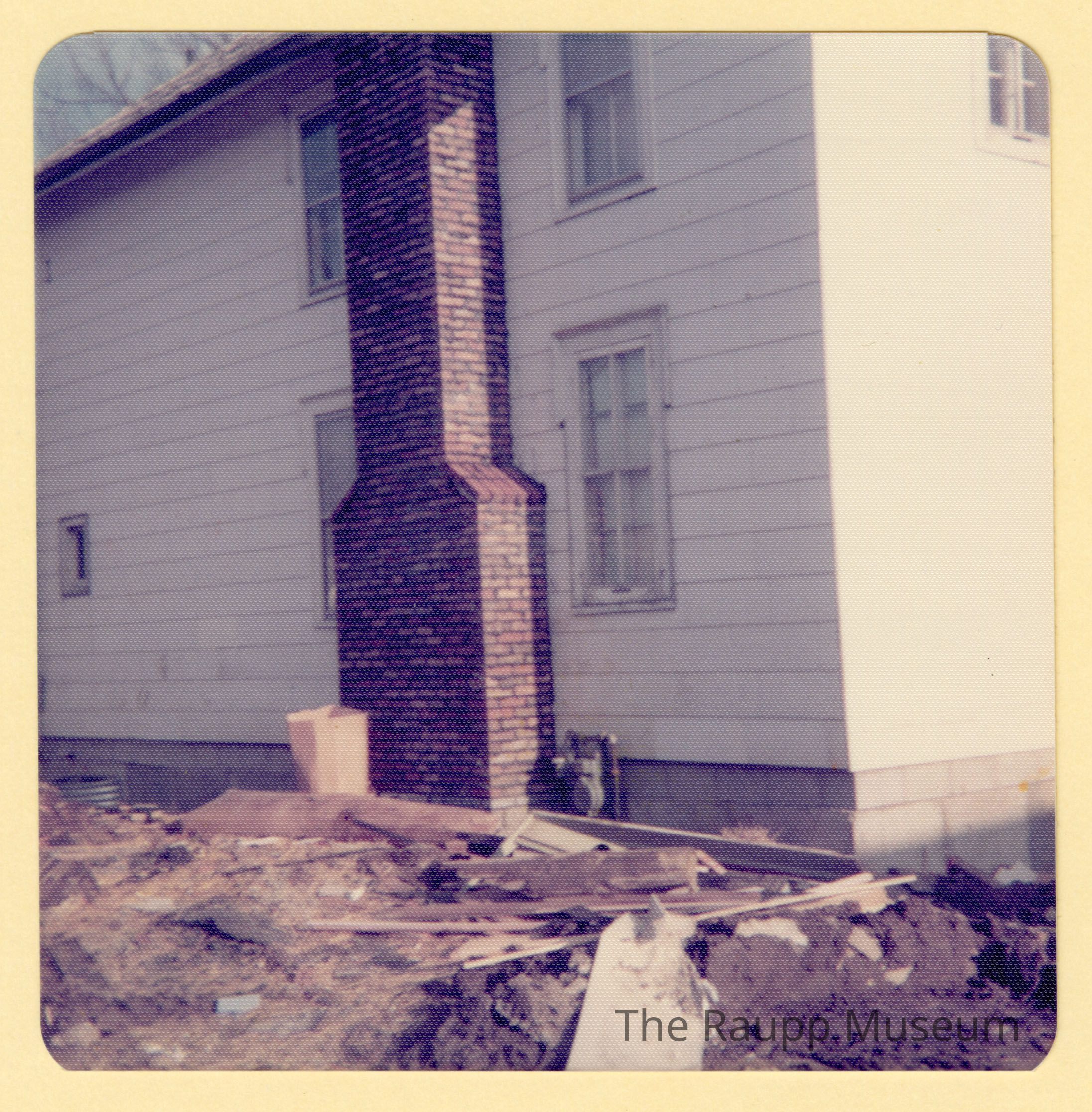 One (1) color photograph of the side of the Weidner family home, with a brick fireplace on the outside of a wide wooden exterior side of the house. There are four windows around the fireplace, two on each side. There is dirt and wood planks on the ground. This was taken during the moving of the Weidner family home, to make way for Lake Cook Road.