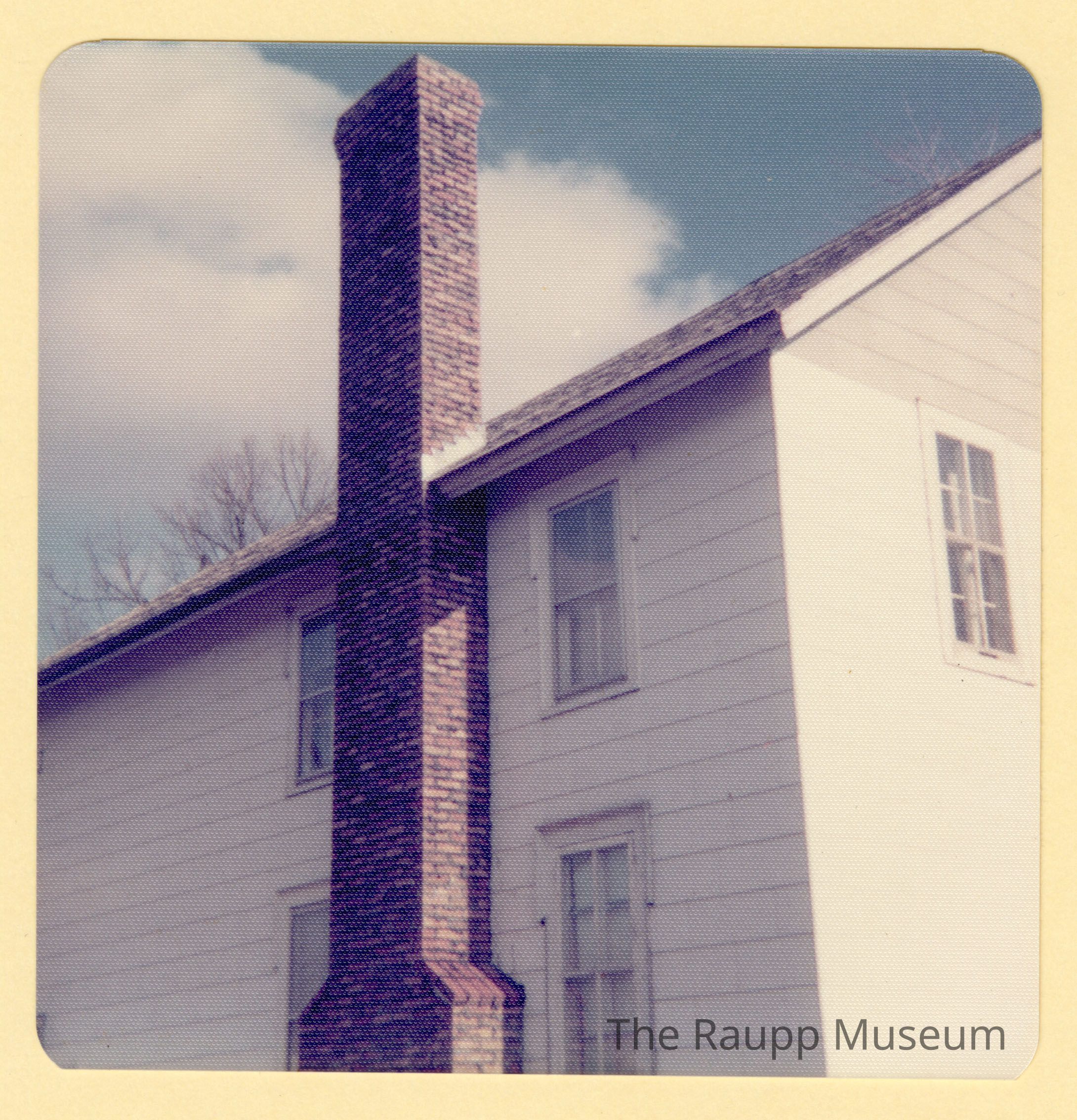 One (1) color photograph of the top part of a home, focused on a brick fireplace on the outside of the home. Fireplace is wider at base and narrower on top half. The house is white plank wood with a shingle roof. There are 5 windows visible (4 on one side, 1 on another). This was taken during the moving of the Weidner family home, to make way for Lake Cook Road.