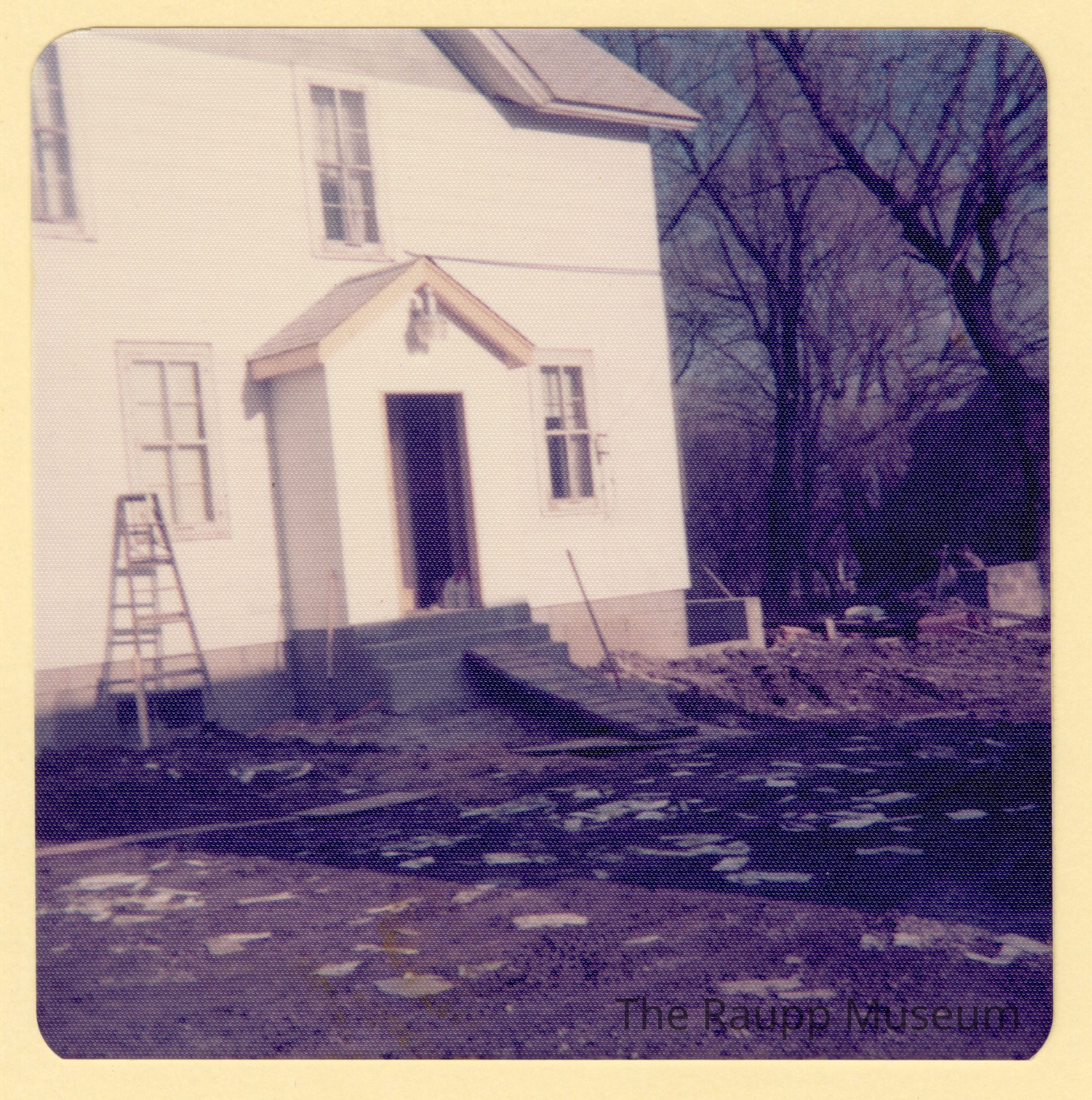One (1) color photograph of the front of the Weidner family home during construction to move the home. Photo is taken on an angle with the front part of the house visible. There is a small part that juts out the front, with the door opening and a light is above it. There are 4 windows visible, with a metal ladder leaning against the home. There is dirt and a wooden plank walkway to the front. This was taken during the moving of the Weidner family home, to make way for Lake Cook Road.