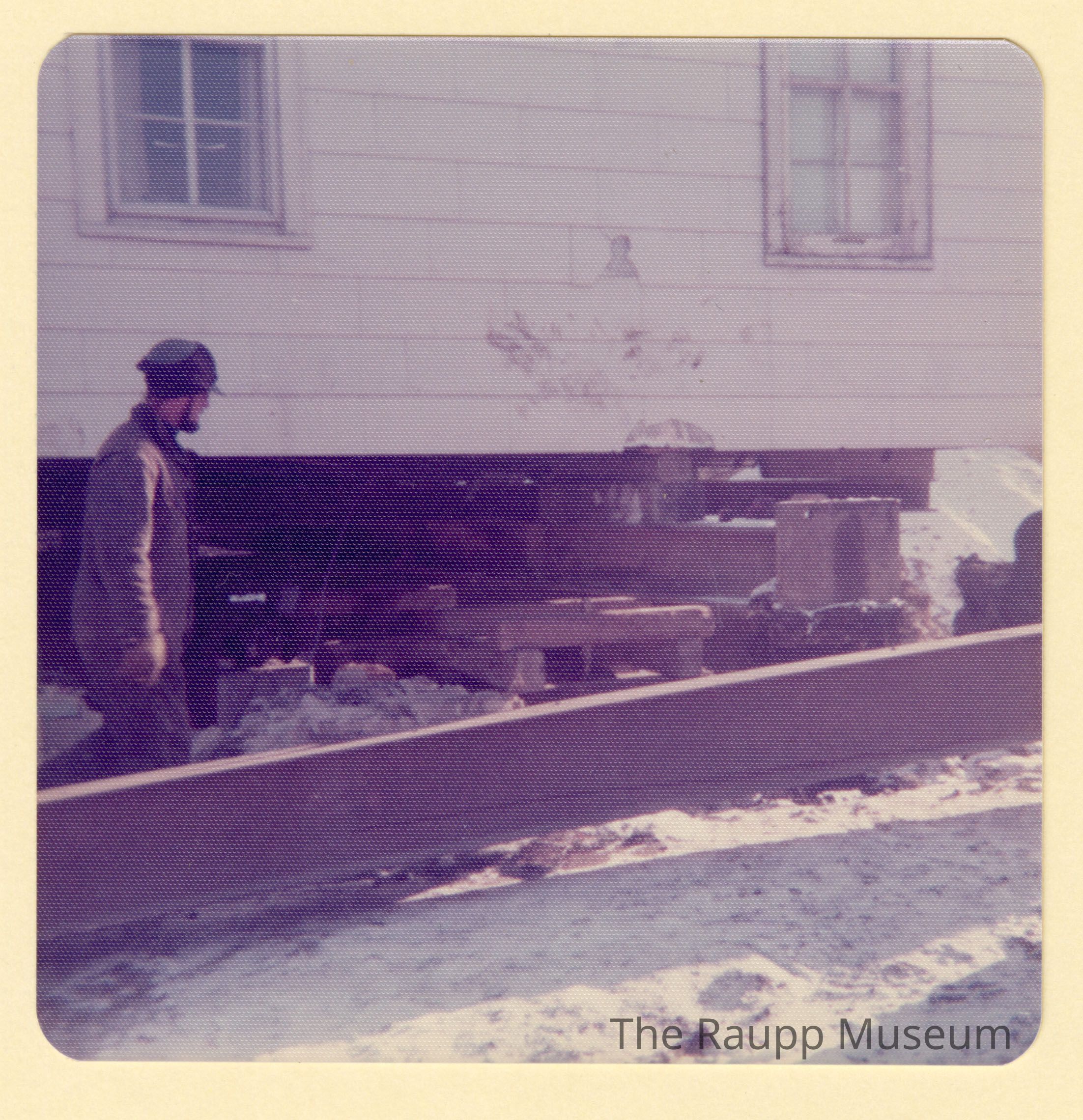 One (1) color photograph of the base of a white wooden home being lifted off the foundation on wooden beams. There is a man in brown work outfit on the left side looking down. There are two windows visible in the top. There is snow on the ground. This was taken during the moving of the Weidner family home, to make way for Lake Cook Road.