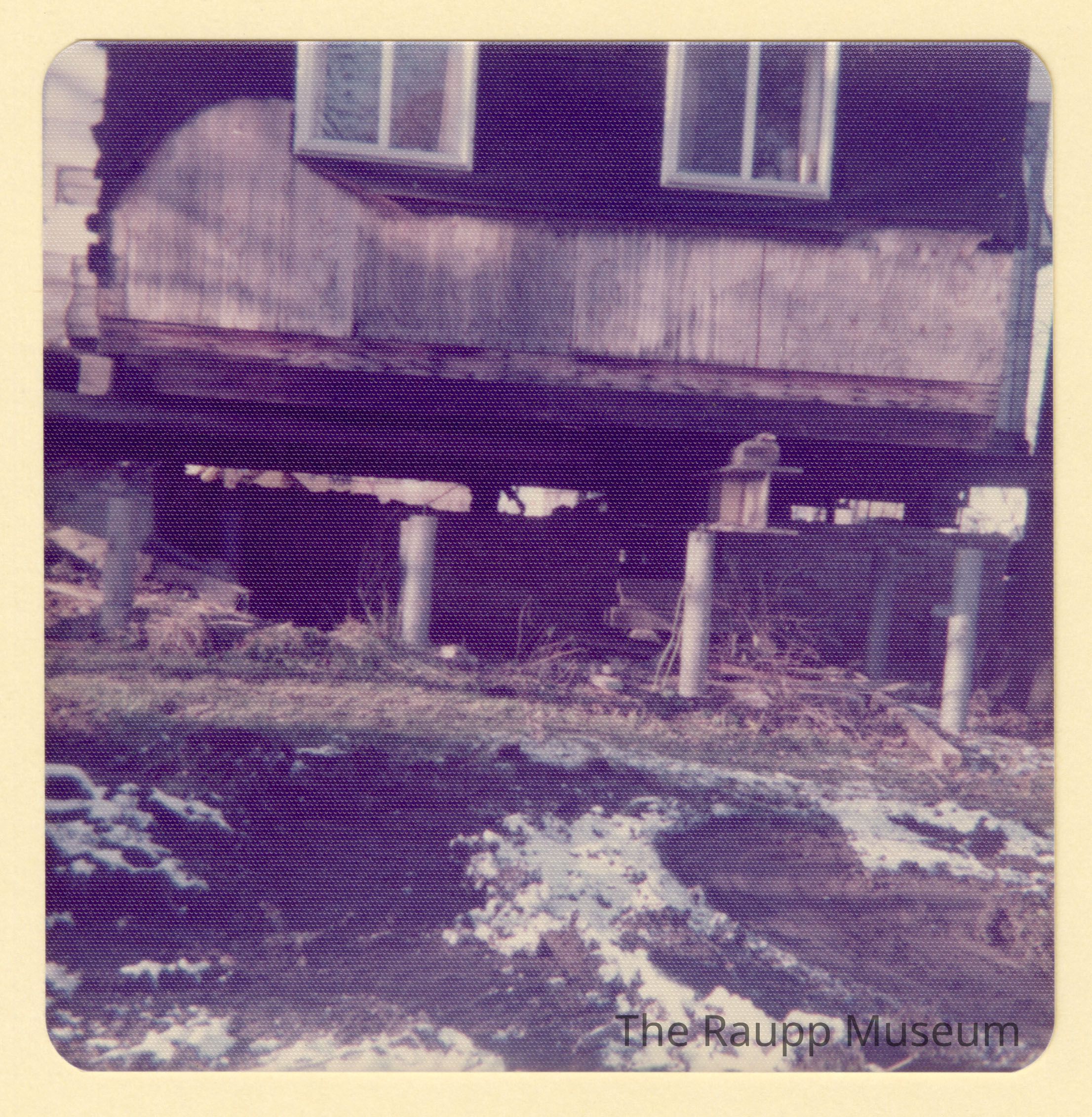 One (1) color photograph of the base of a home, lifted off the stone foundation on metal stilts and metal beams. The part lifted is a dark wooden square with two windows. There is a stone foundation visible underneath and some dirt and snow in the foreground. This was taken during the moving of the Weidner family home, to make way for Lake Cook Road.