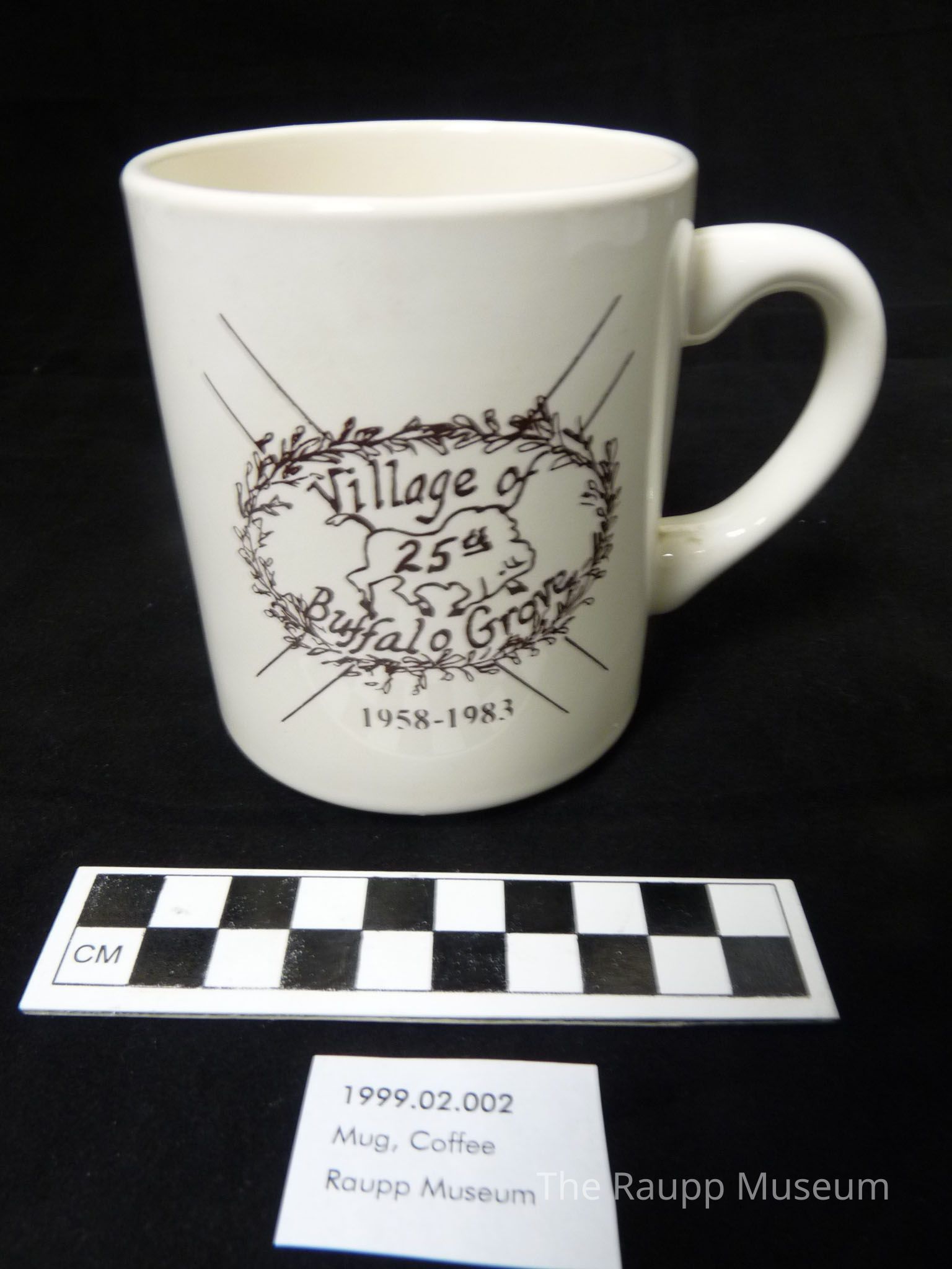 One (1) white and black porcelain commemorative coffee mug. Mug is white with a black line drawing printed on one side. Picture shows a buffalo silhouette in a vine wreath with the words: "Village of Buffalo Grove, 25th, 1958-1983".Dimensions