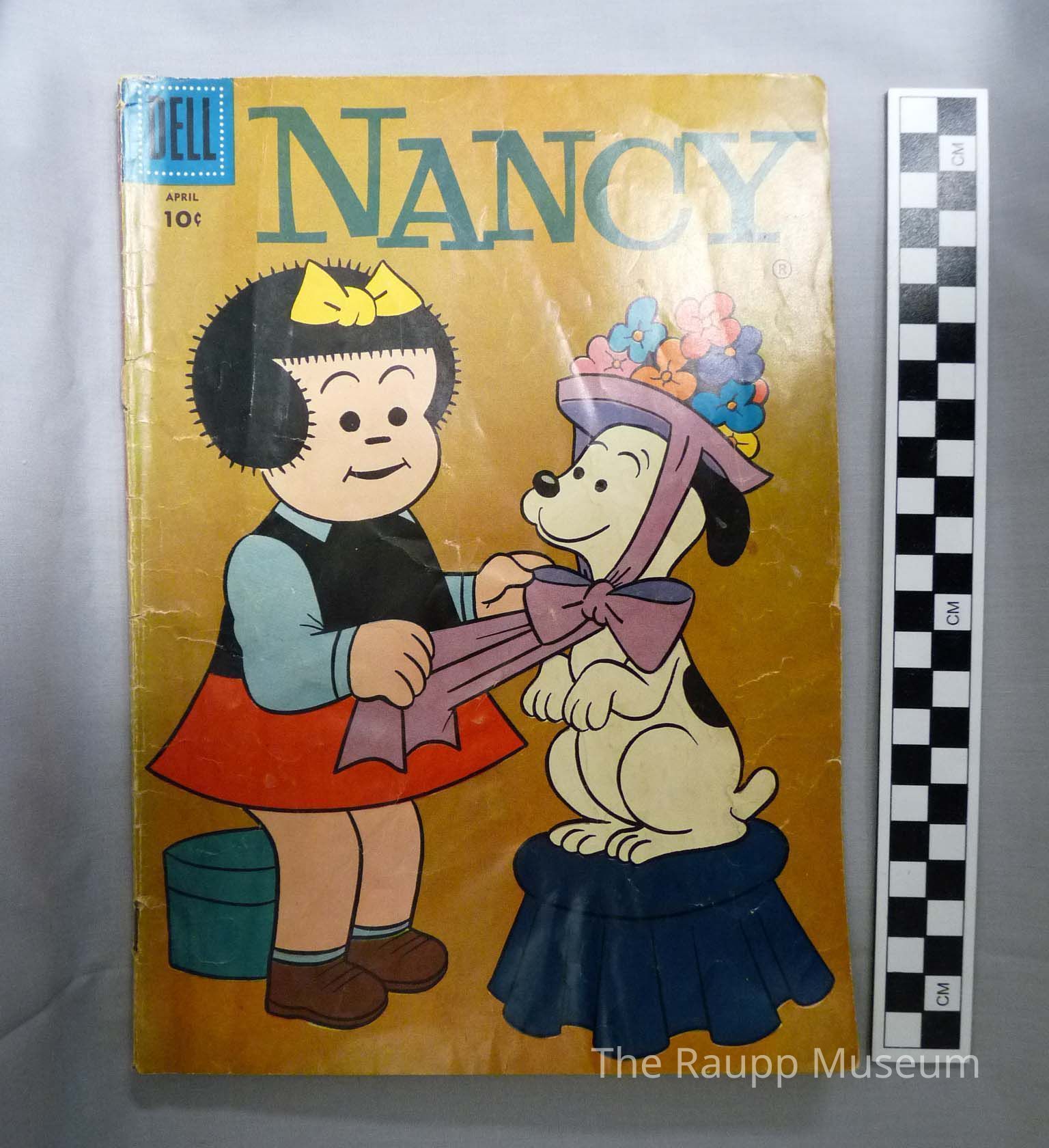 One (1) comic about a girl named Nancy. The front cover has a glossy color drwaing of a girl in a red and black dress, with blue shirt underneath tying a flower hat on a small dog. The comic pages are in color. The back cover has an ad for Scotch tape and free Acro-Pets that come with buying the tape.