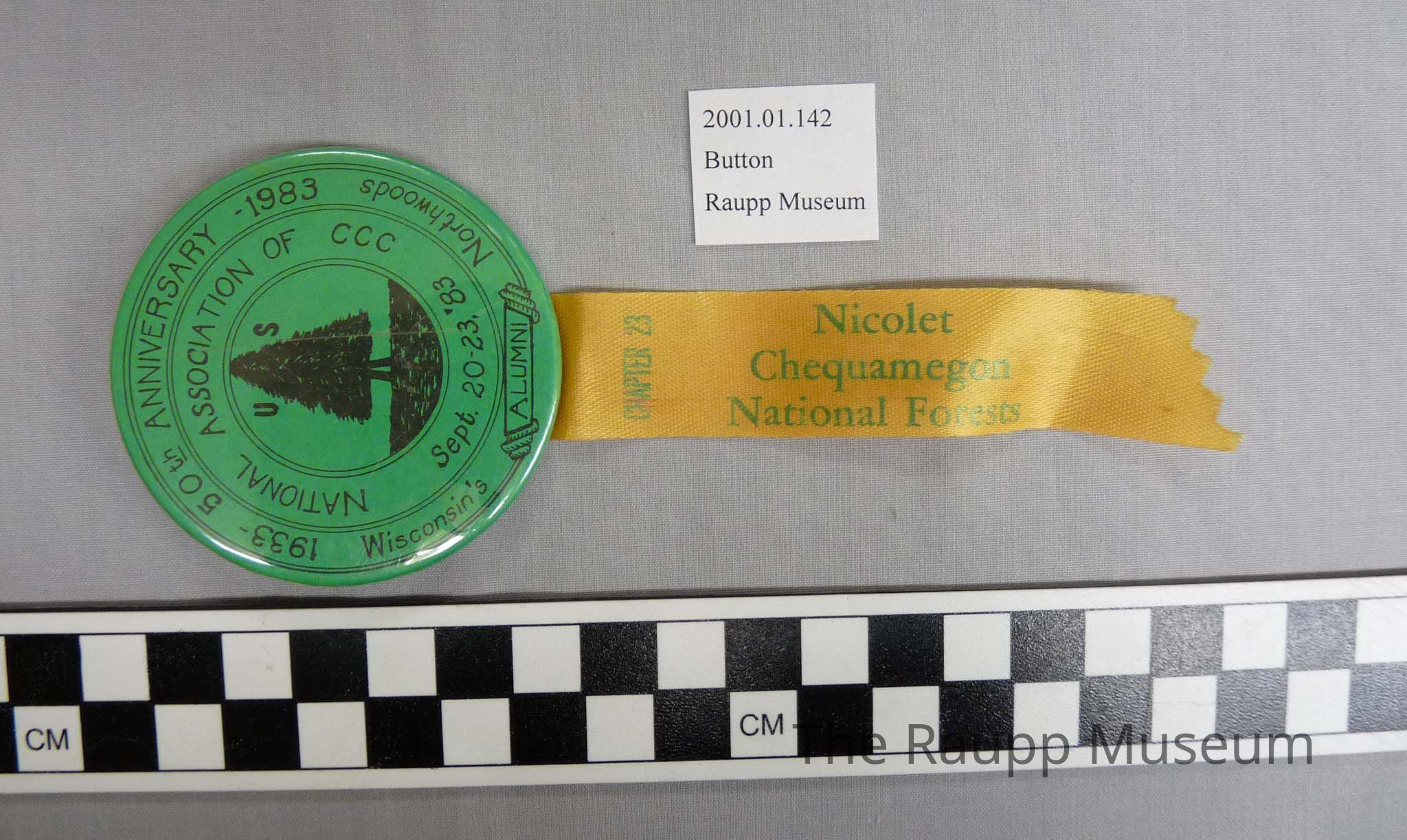 One (1) metal commemorative button, with green base has black lettering and a tree logo in the center. Arched along reads: "1933-1983 50th Anniversary Sept. 20-23, '83, Wisconsin's Northwoods Alumni, National Association of CCC". A gold ribbon hanging down from the pin reads "Chapter 23, Nicolet Chequamegon National Forests" in green text. The black of the pin is silver with a metal safety pin.Material