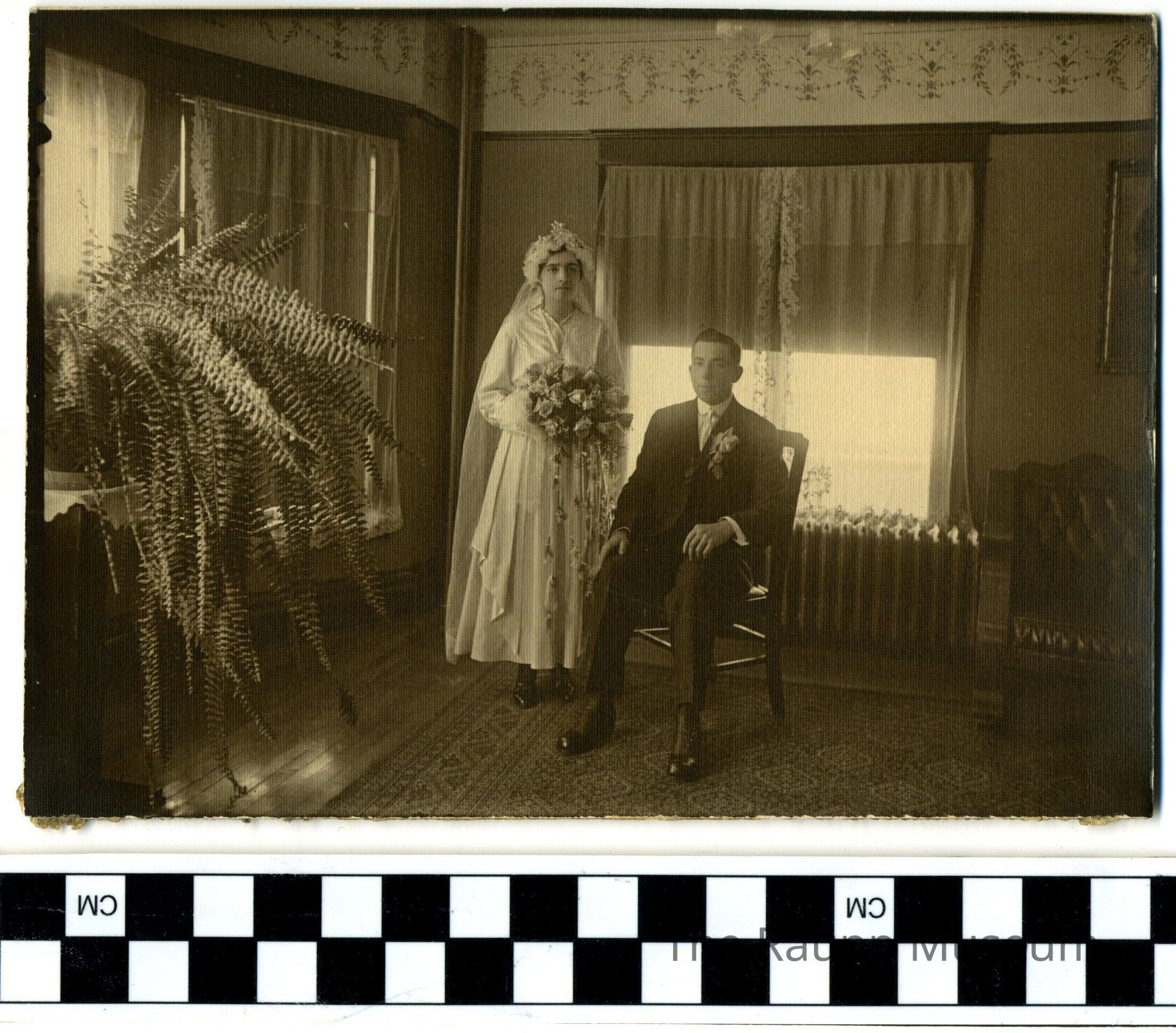 Black and white image with sepia tones and grid patterned textured paper. Image of "Nebraska Neiburs" wearing wedding clothes. They are in the parlor of a house with a large fern on the left of the image. She is standing in the center left wearing an ankle length draped dress with long sleeves and holding a large bouquet of roses with cascading ribbons. Her headpiece has fluffy tulle and veil falls to her ankles. He is seated in a chair and is wearing a dark suit and matching boutonniere.