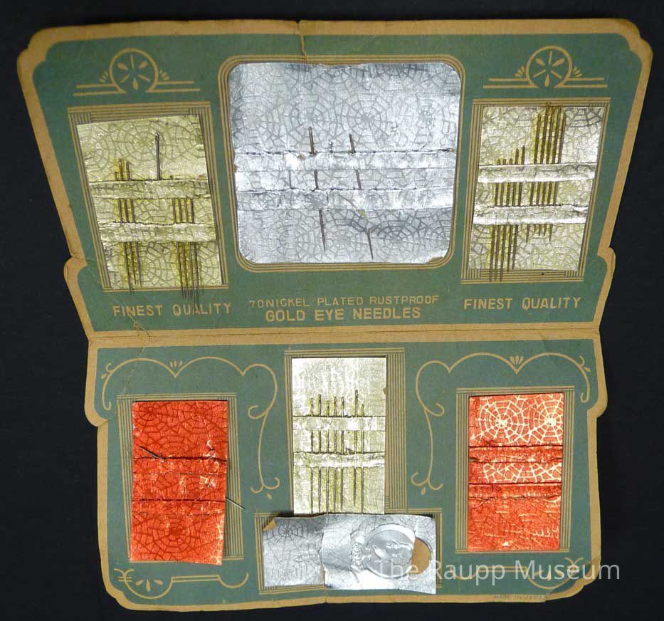 The interior of the card has three sets of foil papers that hold an assortment of sewing needles. The text suggests the package contains 70 nickel plated rustproof gold eye needles of the finest quality. It actually contains 28 needles and one needle threader. All of the needles look rusty. With handwritten ink across the front cover. "four cents."