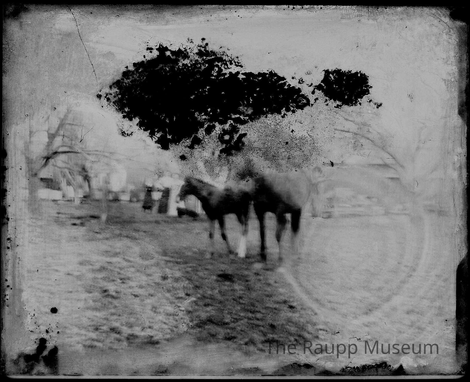 Negative depicting 2 horses; several people standing to right of horses. Top portion of negative is missing.