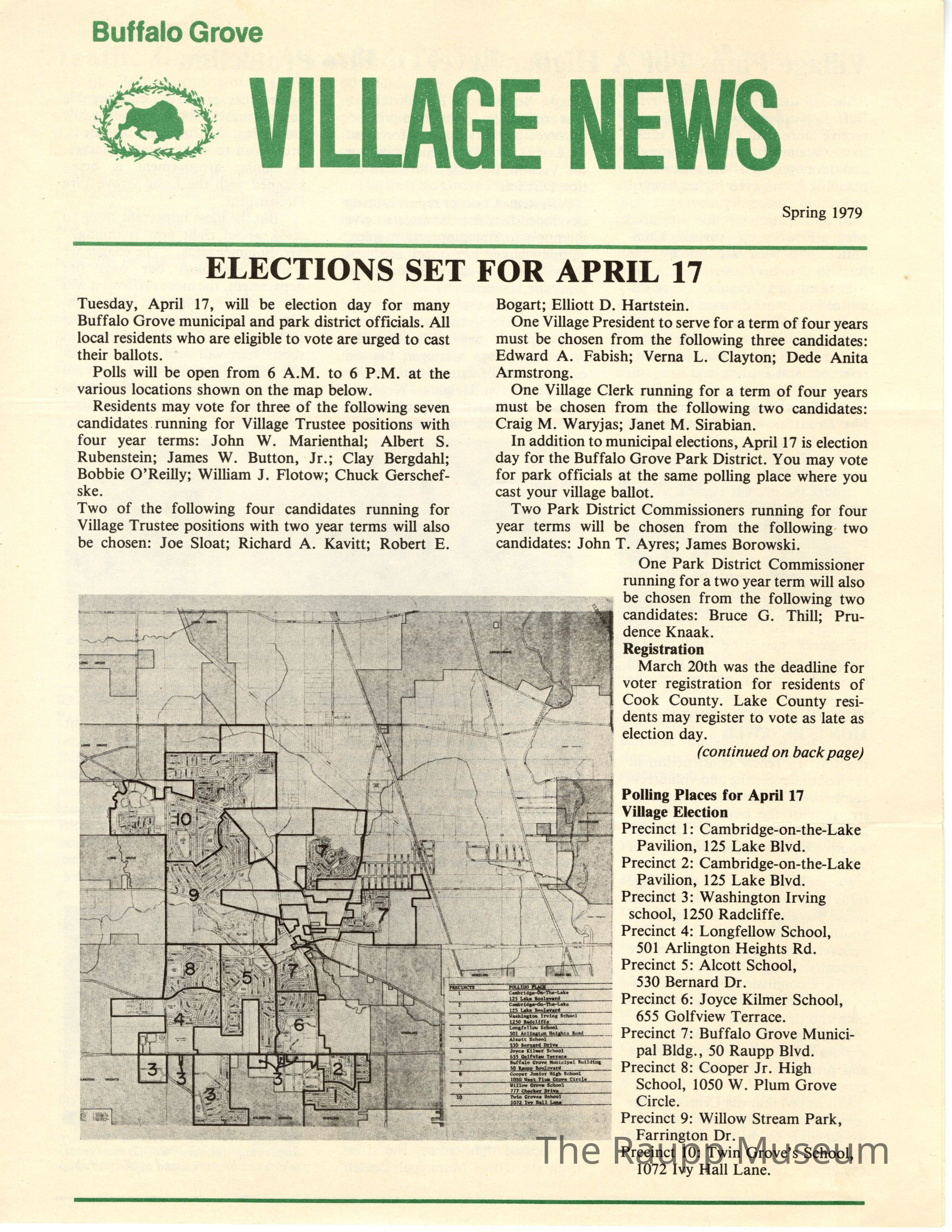One (1) BG Village News for Spring 1979. Has green headline with Buffalo stencil. Contains articles and b/w pictures. 4 pages. A map is on the front.
