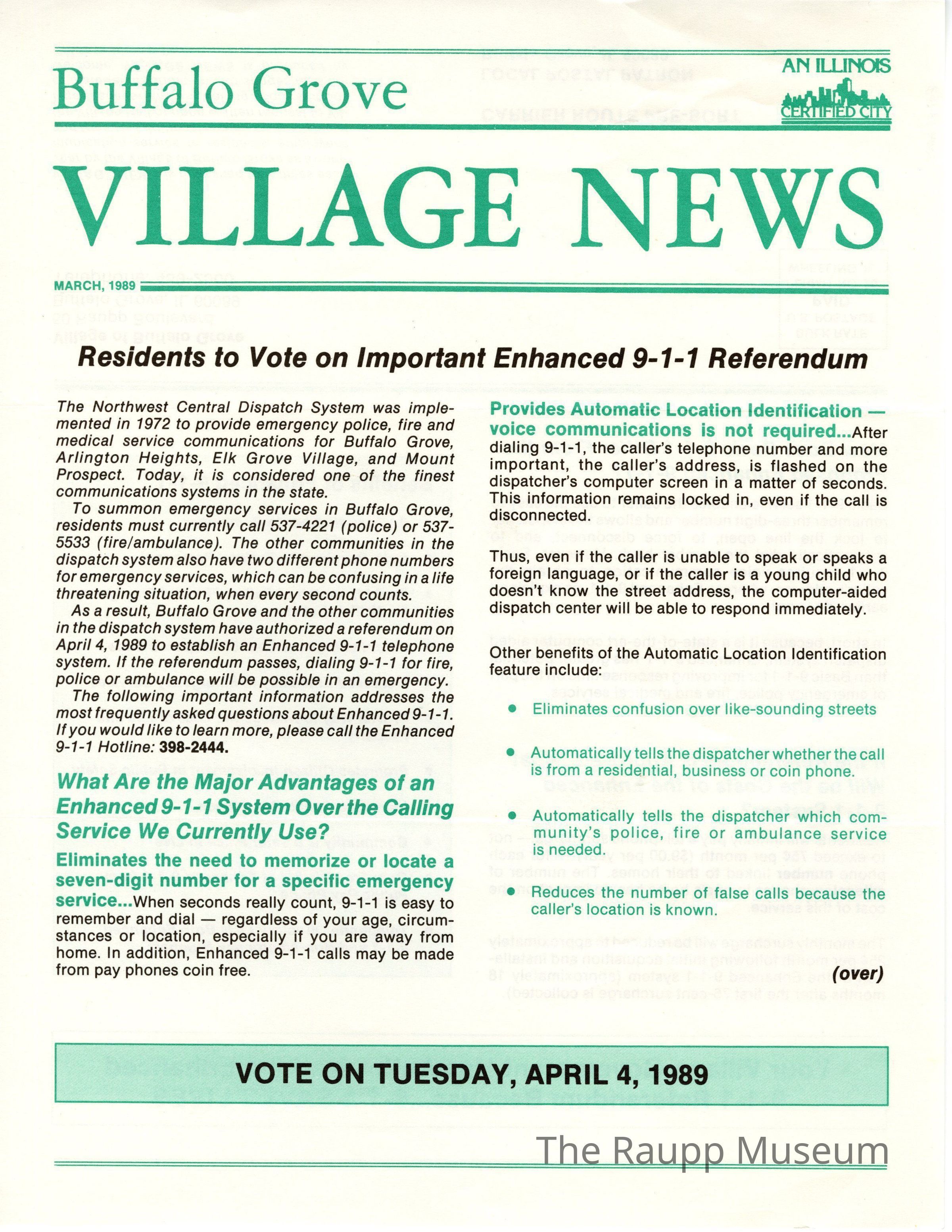 One (1) double sided BG Village News for March 1989. Green and black lettering.