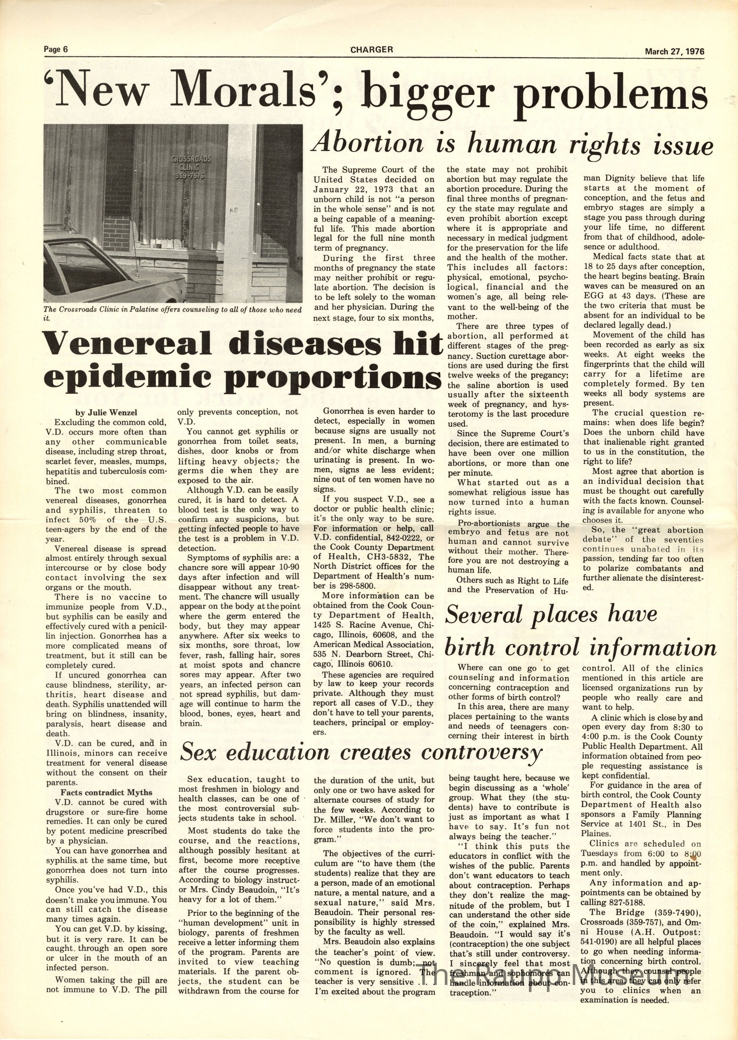 page 6: 'New Morals'; bigger problems, abortion is a human rights issue; Venereal diseases hit epidemic proportions; Several places have birth control information; Sex education creates controversyArchive Details