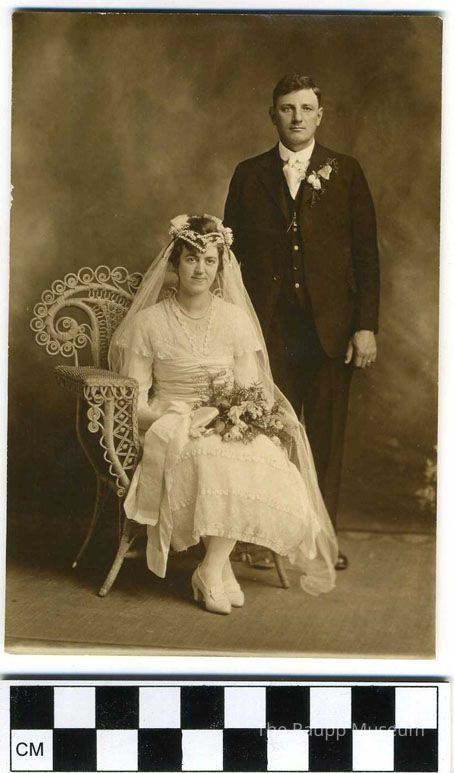 Black and white photographic print. Image of Nicholas Horcher and Lorena Weidner. Nicholas is standing on the right wearing a suit with white tie and flowers in his lapel. Lorena is seated in a wicker chair wearing an ankle length white dress with long sleeves, long veil and holding flowers on her lap. reverse side has pencil inscription across lower edge: "Nick Horcher."Relationships
