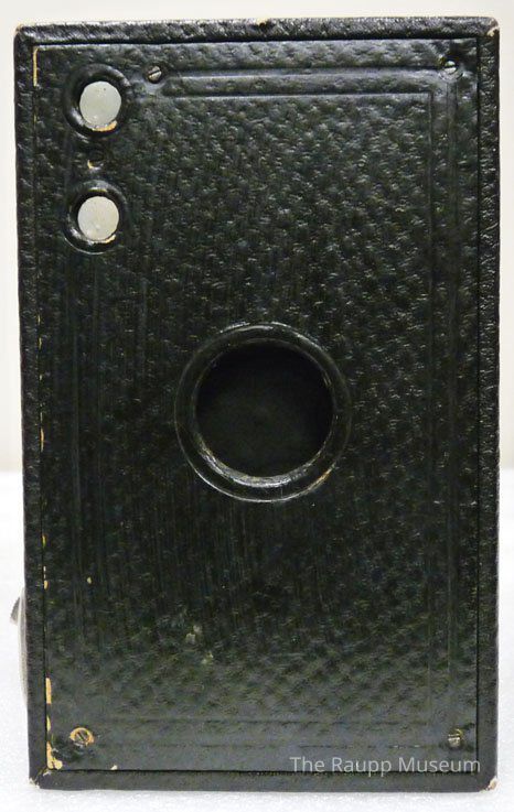 Brownie box camera. Leatherette covered card case with metal film carrier. Leather carrying handle mounted on the top. Case removed for film loading by releasing two pivoted catches and pulling out winding keý on the side. Two reflecting finders, tripod sockets, and a trigger guard. Uses No. 130 film.Dimensions