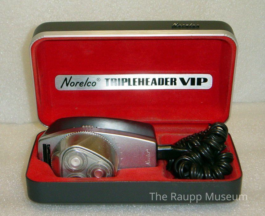 A: Plastic razor in a case, attached to a cord which can plug into a wall, 3 wheels on razor for shaving, with 8 different settings for shaving. "Norelco Tripleheader VIP" stamped on front of razor, also "O-8" stamped along bottom of the wheel.
