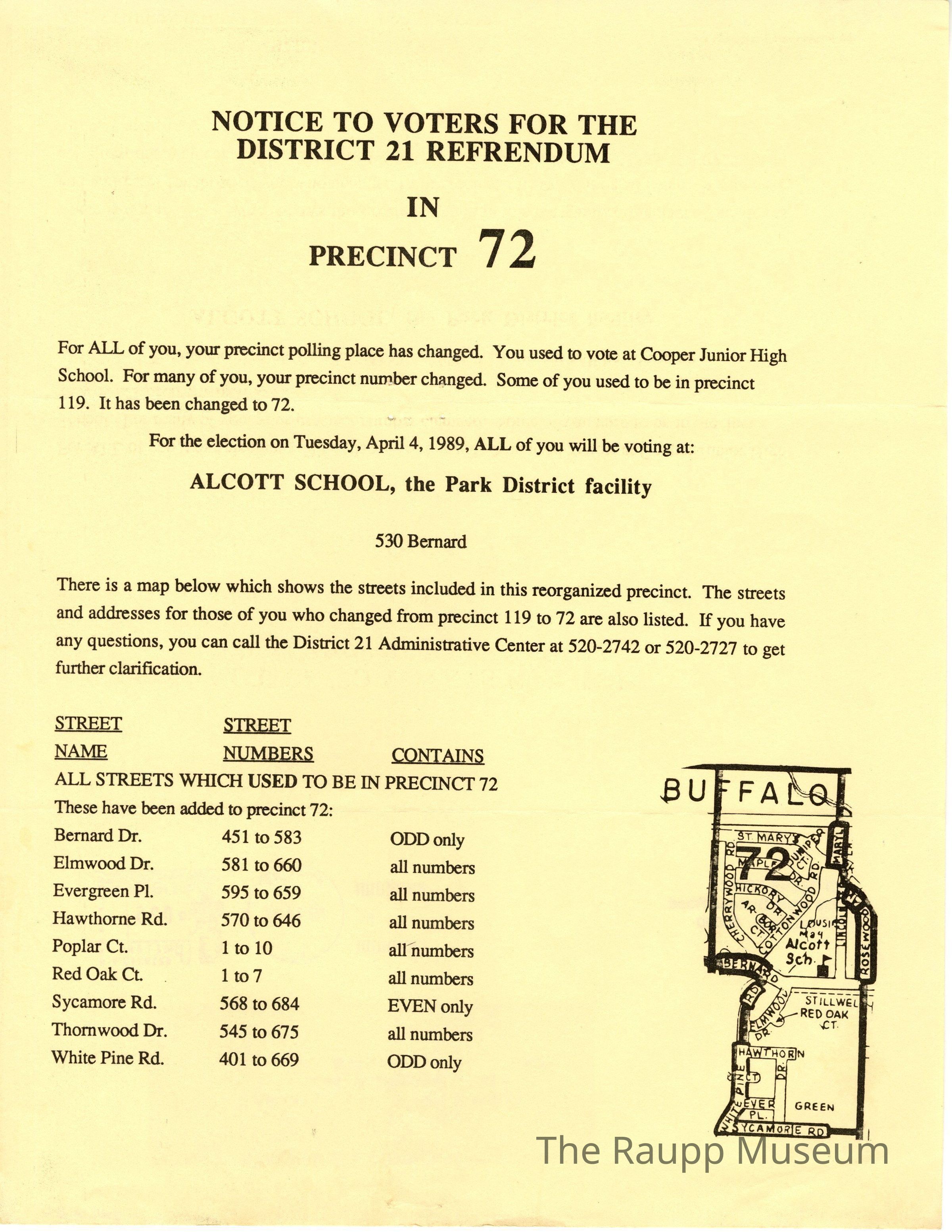 One (1) beige pamphlet from Citizens for 21, about a change in polling place for precinct 72 to Alcott School.