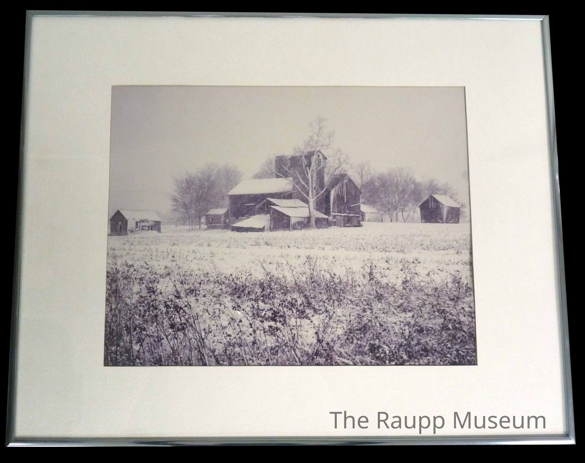 Black and white photograph of the old Happ Farm on Dundee Road across from the Toyota Dealership in Buffalo Grove. Mounted in silver metal frame with white mat.Dimensions