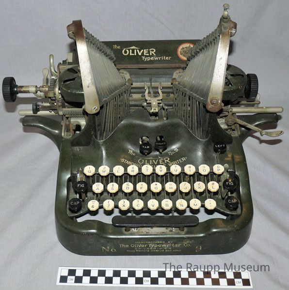 Typewriter with dark green metal casing and plastic buttons. The number 9 model is distinguished by right and left shift keys and a two-color ribbon. Oliver's are "down strike" typewriters, meaning the typebars strike the roller from above. It allows the full page to be visible as the text is being entered.