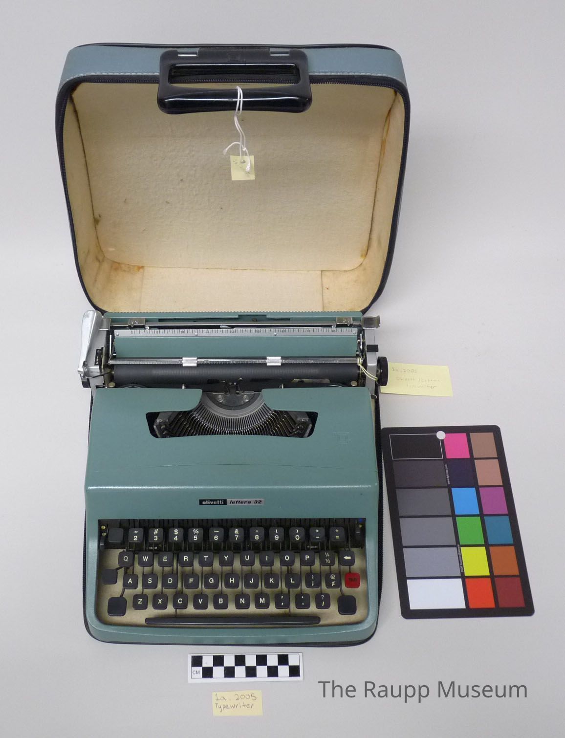 One (1) typewriter with the title Olivetti Lettera 32 made by Olivetti between the years 1964 to 1977. The metal casing is green. The keys are plastic and are black with white letters, with the exception of the "TAB" key that is red with black letters. The right side of the typewriter has a switch for the blue, white, and red options as indicated by the dots of those colors. The title "Olivetti Lettera 32" is in gray and black above the keys. There are two metal rulers at the top of the typewriter. The typewriter is made of metal and plastic.Dimensions