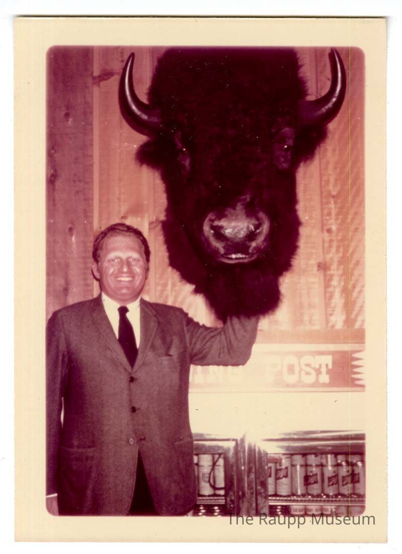 One (1) color photograph of a man with his hand under Buffalo Head, mounted to a wood panelling wall. Underneath are fridges with liquor and a sign that says "Trading Post". Man has a brown suit with black tie and white undershirt. Believed to be Mark Arnove, Properiter of Mark Drugs (further research needed to verify).Dimensions