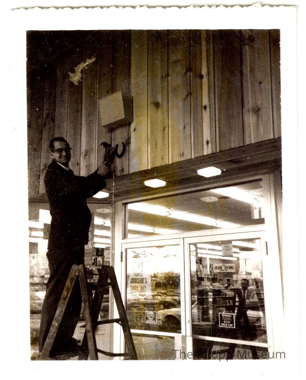 One (1) black and white photograph of the opening of Hornby's in the Ranch Mart Shopping Center. A man is standing on a ladder on the left, holding up a horseshoe hanging above the front doors. He is blocking two glass doors that lead into the store. On the back is handwritten "Opening Hornsby's".Relationships
