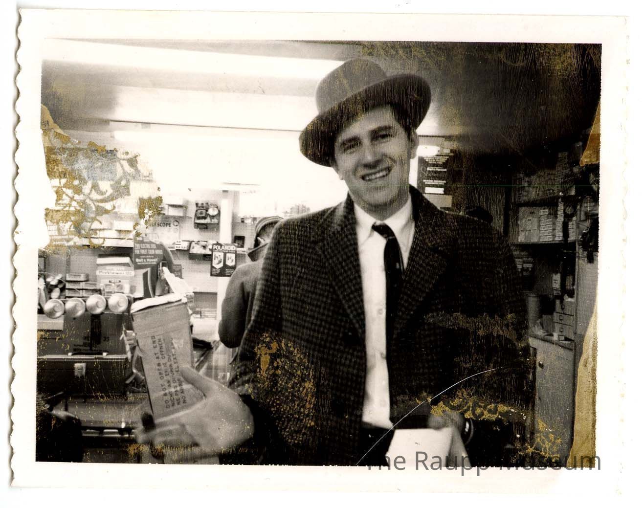 One (1) black and white photograph of Al Frank (?) in a checkered dark suit jacket with white collared shirt and black tie, wearing a bowler hat. He is inside Hornsby's Store with cabinets of cameras and camera attachements. On the back is handwritten "Shopping Center Opening 1965".Relationships