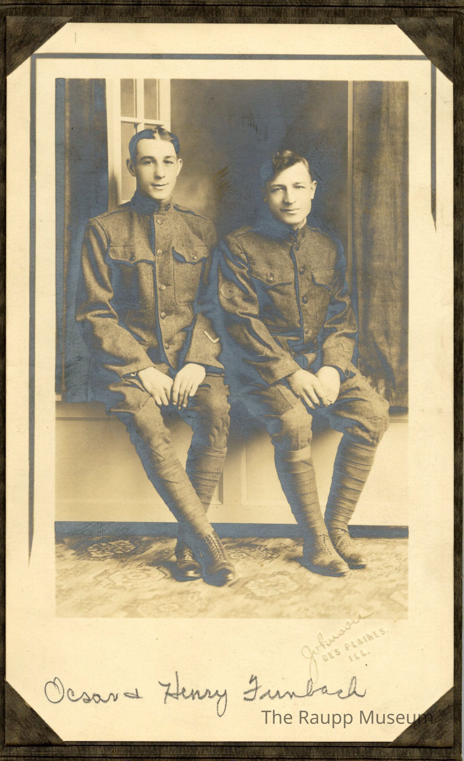 One (1) sepia toned, black and white photograph of Oscar and Henry posing in WWI uniforms. Photo is contained in a tri-fold brown cardboard envelope, with a ribbon embossed design in a circle on the front. The two men are seated next to each other on a bench by an open window (professional portrait studio set up). There is a geometric carpet on the floor. They are in their WWI army uniforms. The man on the left is taller with hair parted in the center (Oscar) and the man on the right is shorter/slouching with hair parted at the left side (Henry). There are dark curtains on the sides and a white window pain visible open on the left.