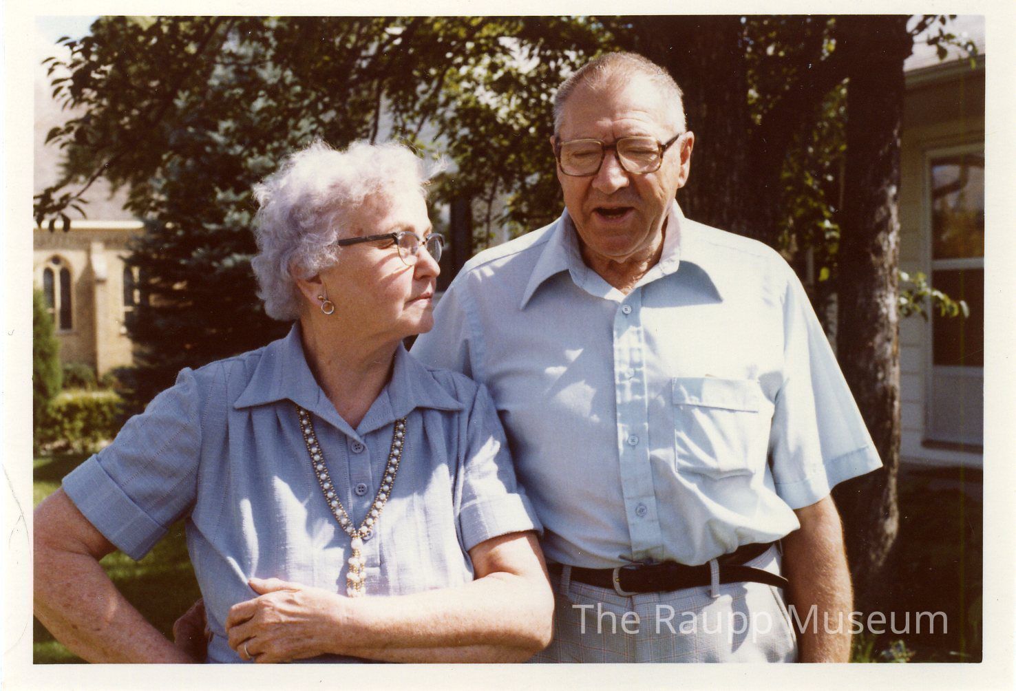 Color photographic print. Image of an older man and woman standing with a white house and St. Mary's Church in the background. Woman is wearing a blue button-down shirt with a long necklace. She is facing the man with a hand on her hip. Man is wearing a light blue, short-sleeved Oxford shirt with plaid trousers and a belt. reverse side marking: "Oscar and Mary Ann Weidner." Image printed on Kodak paper.Made/Created