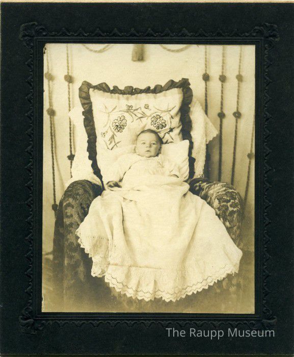 One (1) black and white image sepia toned image of Oscar Weidner as a baby. Oscar is laying in a large chair with a pillow with flowers on it behind him, and a smaller white pillow right behind him. He has on a white large dress. There are ropes/cords hanging behind him on the wall. The photo is enclosed in an embossed black frame. On the back is handwritten "Oscar Weidner".Dimensions
