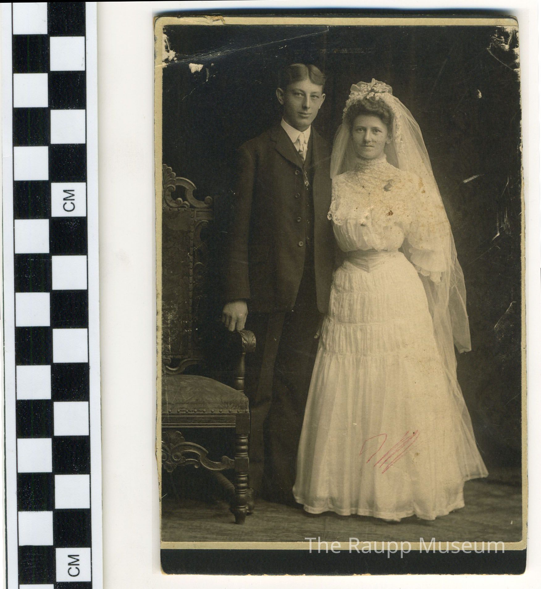 Black and white image with slight white border mounted to black card. Wedding portrait image of Otto Firnbach and Eva Joanna Regina Weidner. Otto is standing on the far left next to a high backed chair wearing a dark four button suit and white tie. His hair is parted in the center. She is wearing a S-silhouette dress with a high lace collar, puffed sleeves, triangular shaped belt, and three-tiered skirt. She is also wearing a knee-length veil. Both are wearing watch fobs pinned to their shirts.