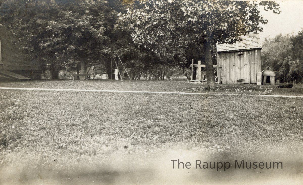 One (1) black and white photographic print of an outdoor scene in the spring/summer. Pictures is an open lawn with a small wood building on the right with an even smaller building to its right (like a dog house). There is a swing under a tree to the left and part of a large brick home on the left. There is a path that goes horizontally across the middle of the picture and grass in front of it.